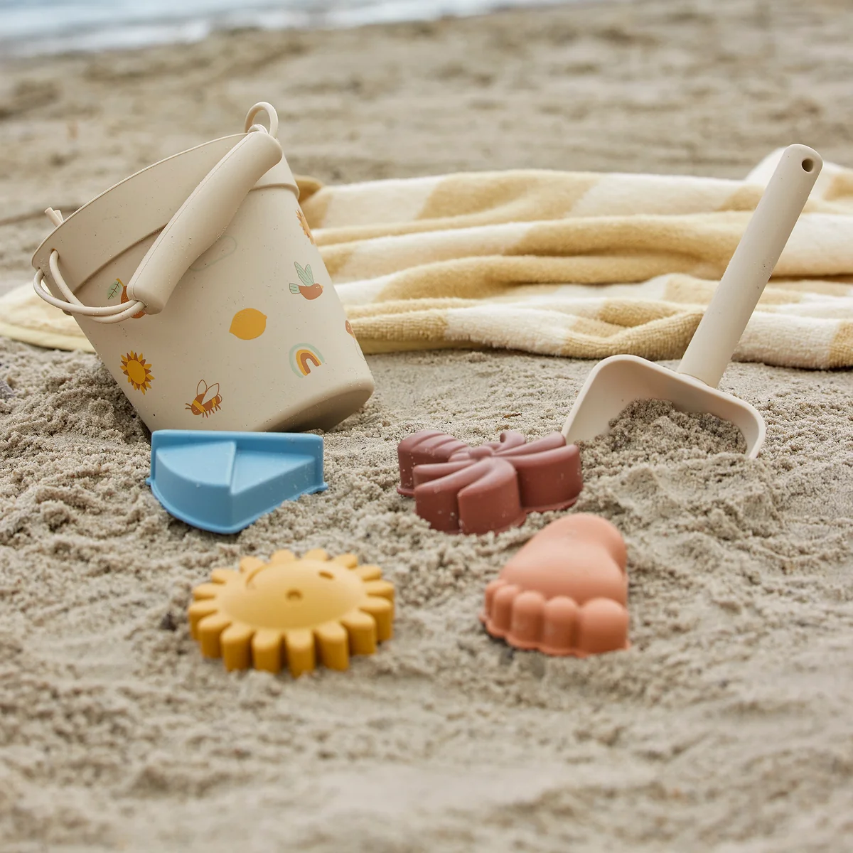 Das Agnes Beach und Sandbox Spielzeug von Bloomingville Mini laden zu stundenlangem Spass und kreativem Spielen im Sand ein. Das Set enthält einen Eimer, Formen verschiedener Figuren und eine Schaufel, perfekt für kleine Hände.