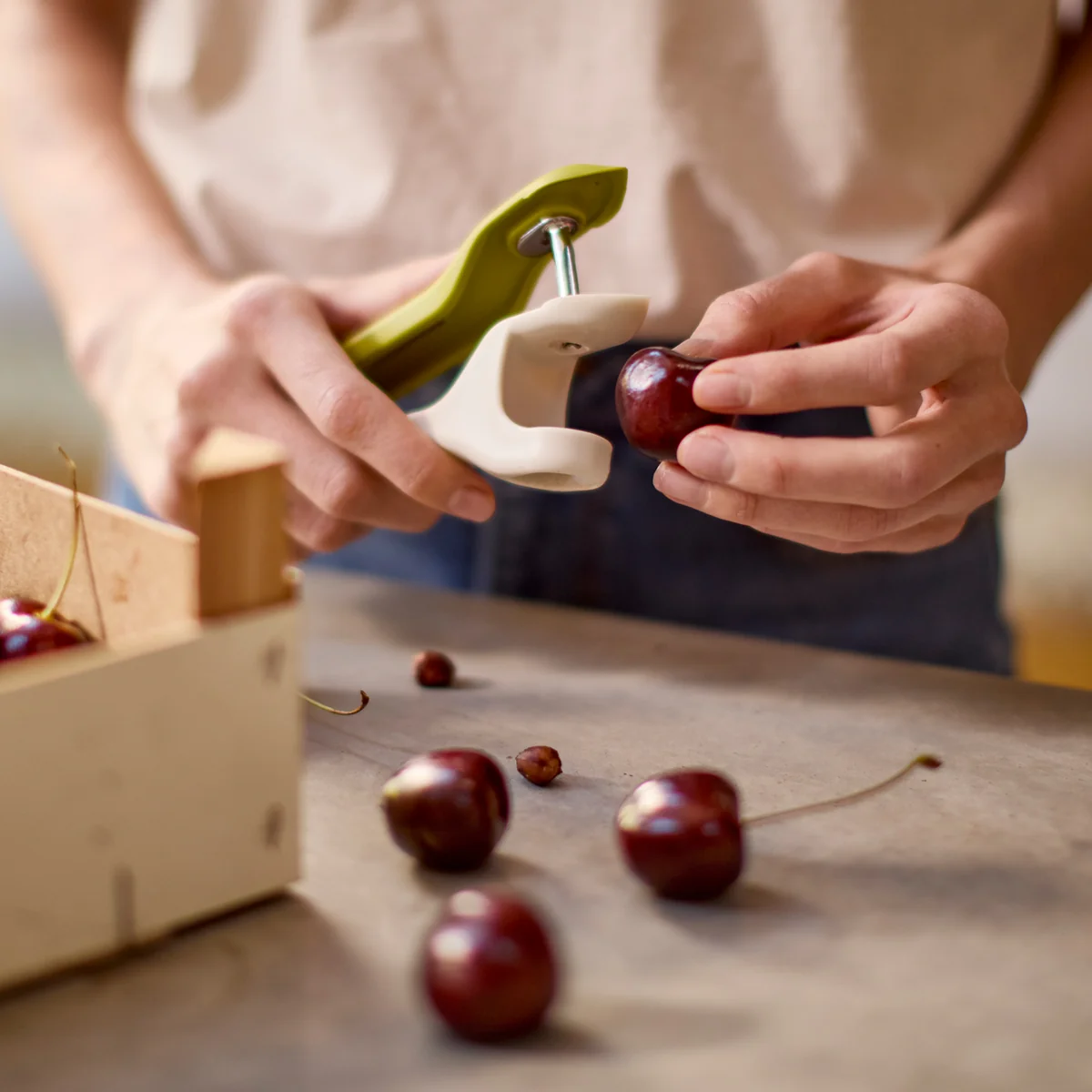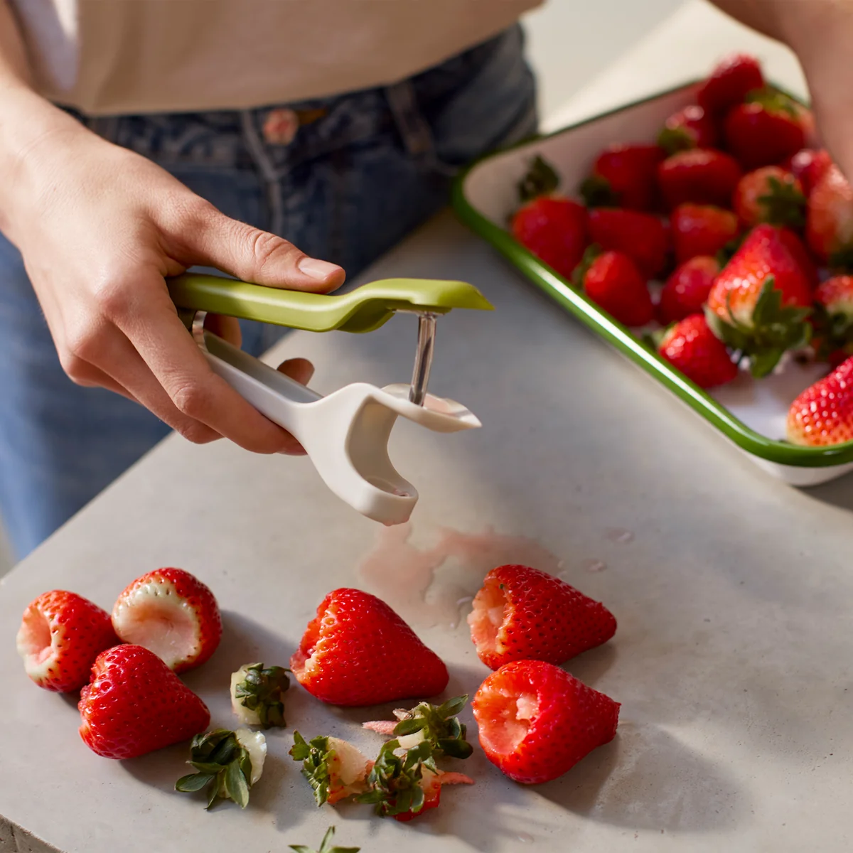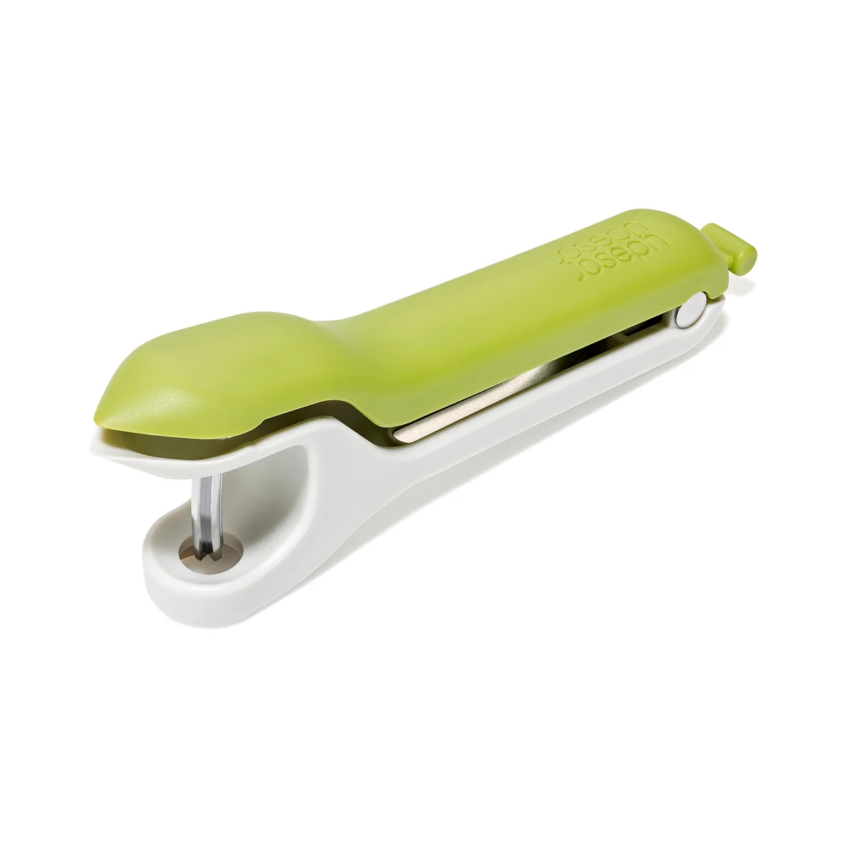 Der Tweezy 2-in-1 Entkerner von Joseph Joseph bietet eine sichere und effiziente Alternative zum Arbeiten mit Messern beim Entkernen und Entstielen von Obst. Er eignet sich ideal zum Entkernen von Kirschen sowie zum Entfernen von Stielen und Strünken bei Erdbeeren und kann auch bei einigen Oliven verwendet werden.