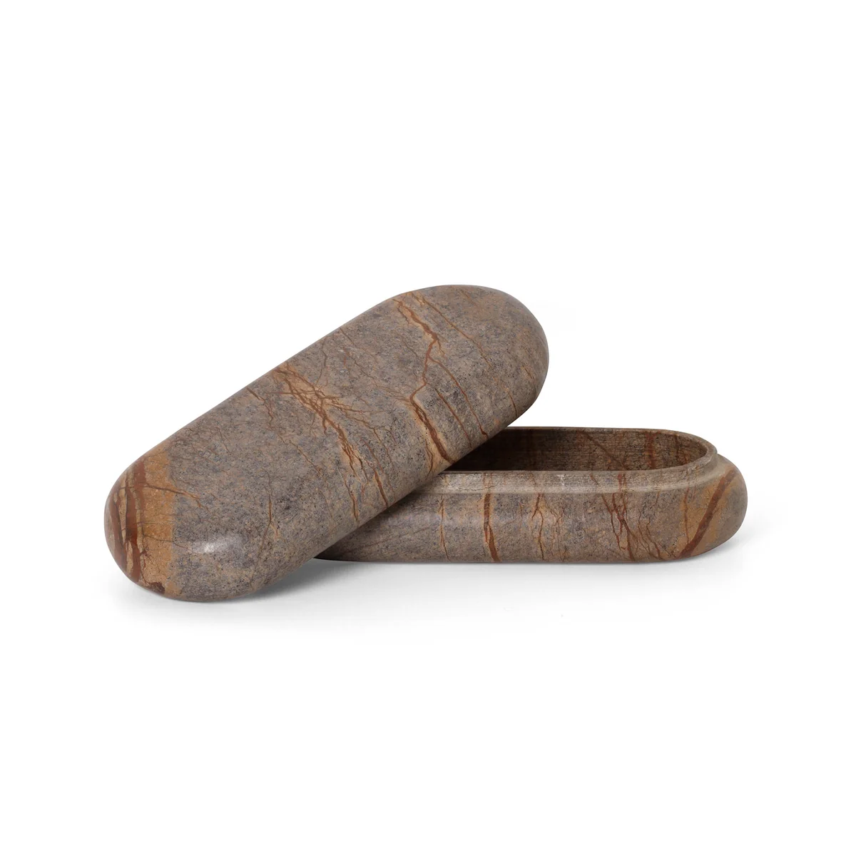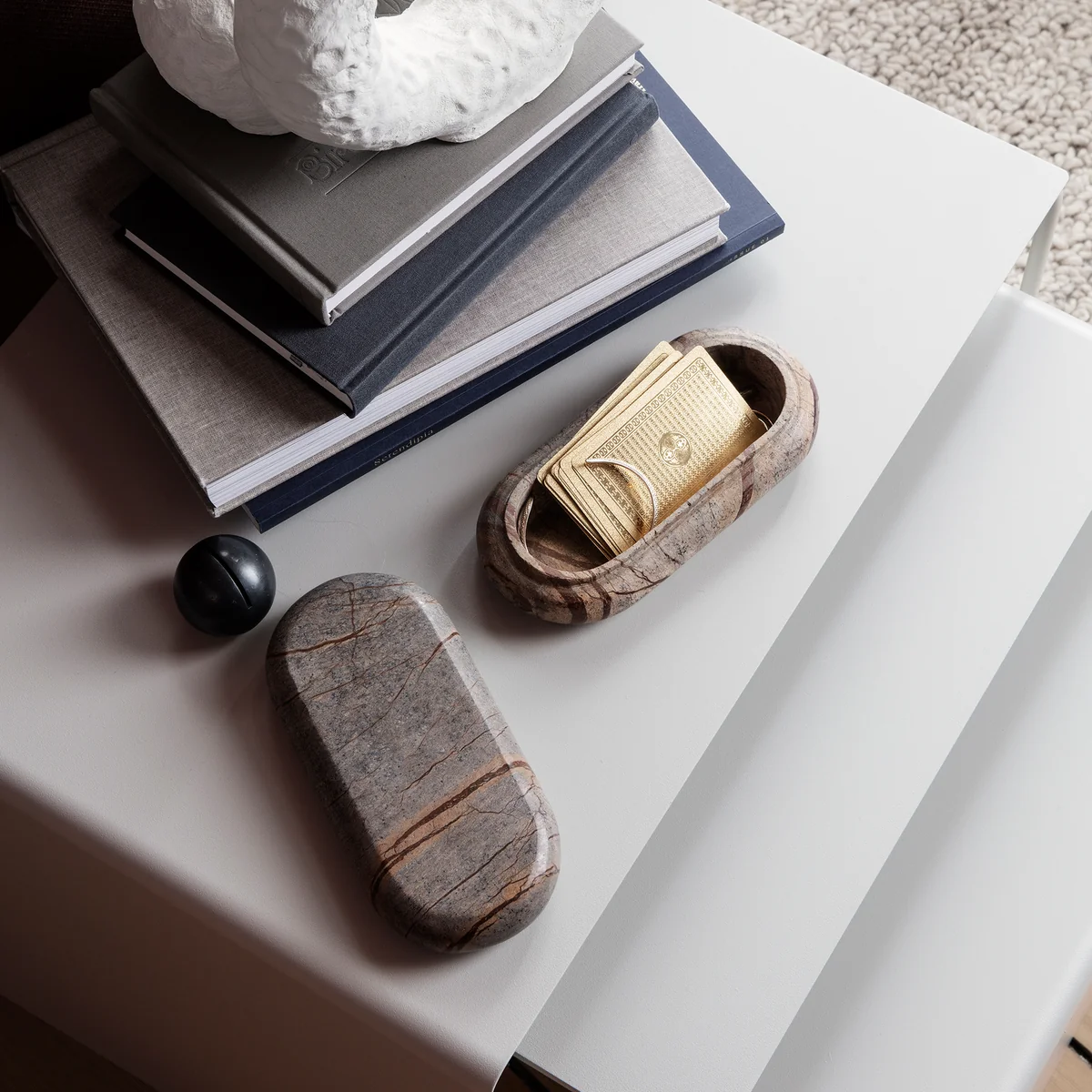 Die Bendum Box von Ferm Living ist eine Box aus hochwertigem Bidasar Marmor und gehört zu einer ganzen Serie an Wohnaccessoires aus diesem Material. Der braune Marmor unterstreicht die weichen Rundungen der Box, die sich hervorragend als Schmuckschatulle macht.