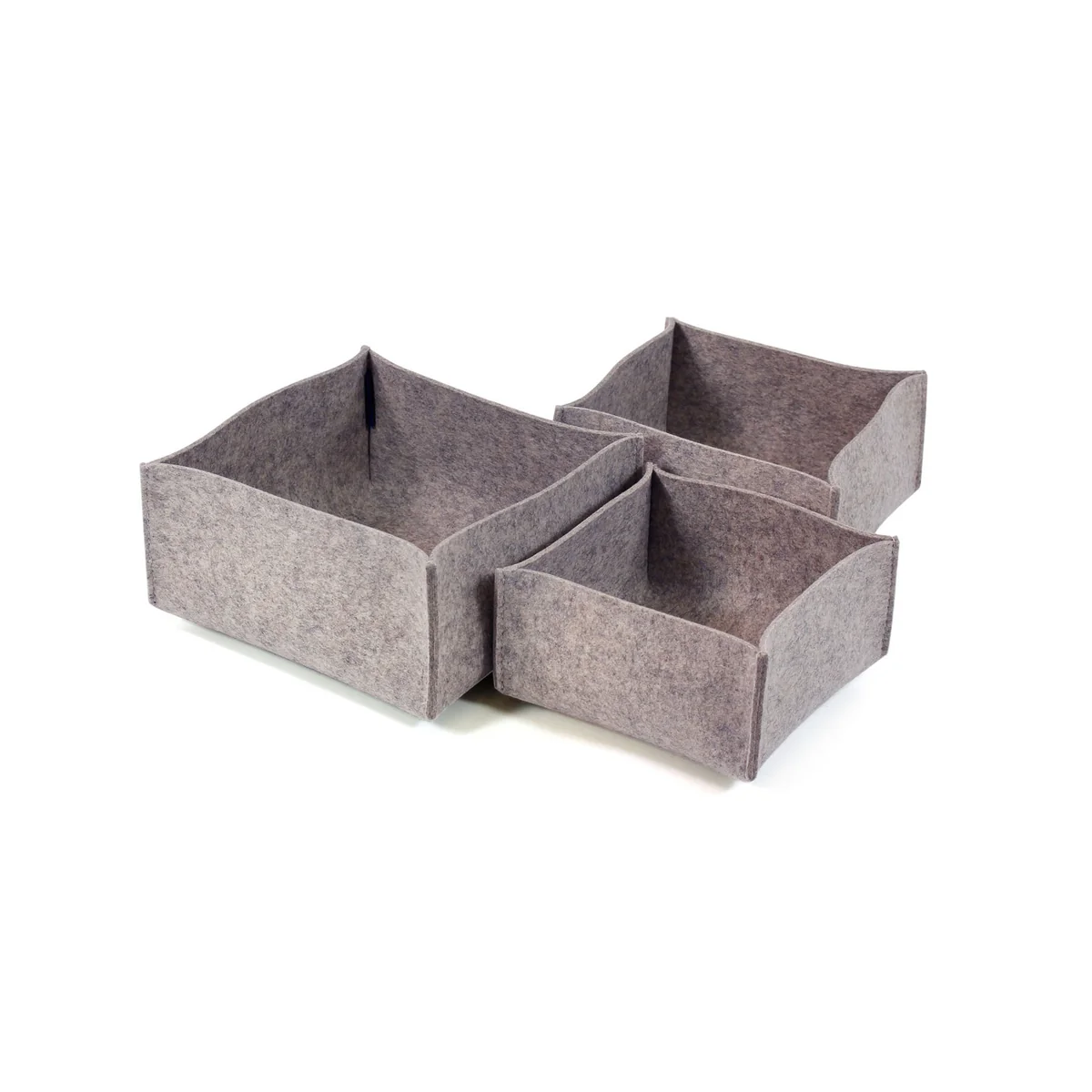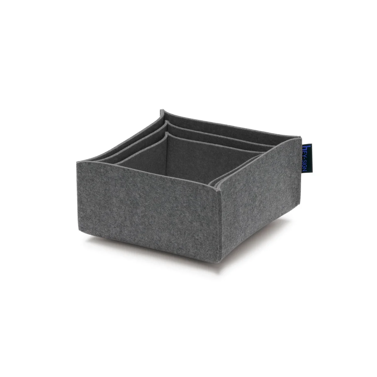 Das Box Set 1 von Hey Sign besteht aus drei unterschiedlich grossen Filzboxen, die sich einfach einander stapeln lassen. Die kleinen Stoffboxen eignen sich zur Aufbewahrung und dem Verstauen unterschiedlicher Dinge.