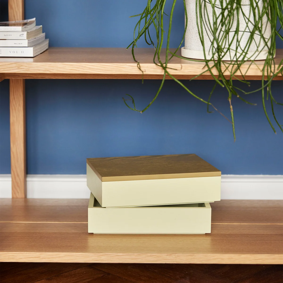 Die Aufbewahrungsbox mit Deckel ist ein vielseitiger Helfer für die ganze Wohnung. Besonders gut kommt die schicke Box im Büro zur Geltung: Die einzelnen Module lassen sich stapeln und nach Wunsch mit einem Deckel verschliessen. Damit passen Kabel, Papiere, kleine Alltagsgegenstände oder Schmuck hervorragend herein. Der Inhalt lässt sich dank des Deckels vor ungebetenen Blicken verbergen. Gleich mehrere der gestapelten Boxen ergeben ein praktisches Regal zum Organisieren auf dem Schreibtisch.