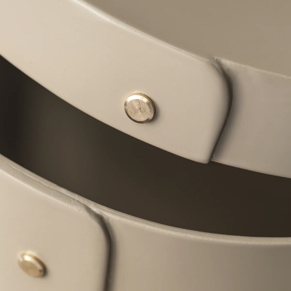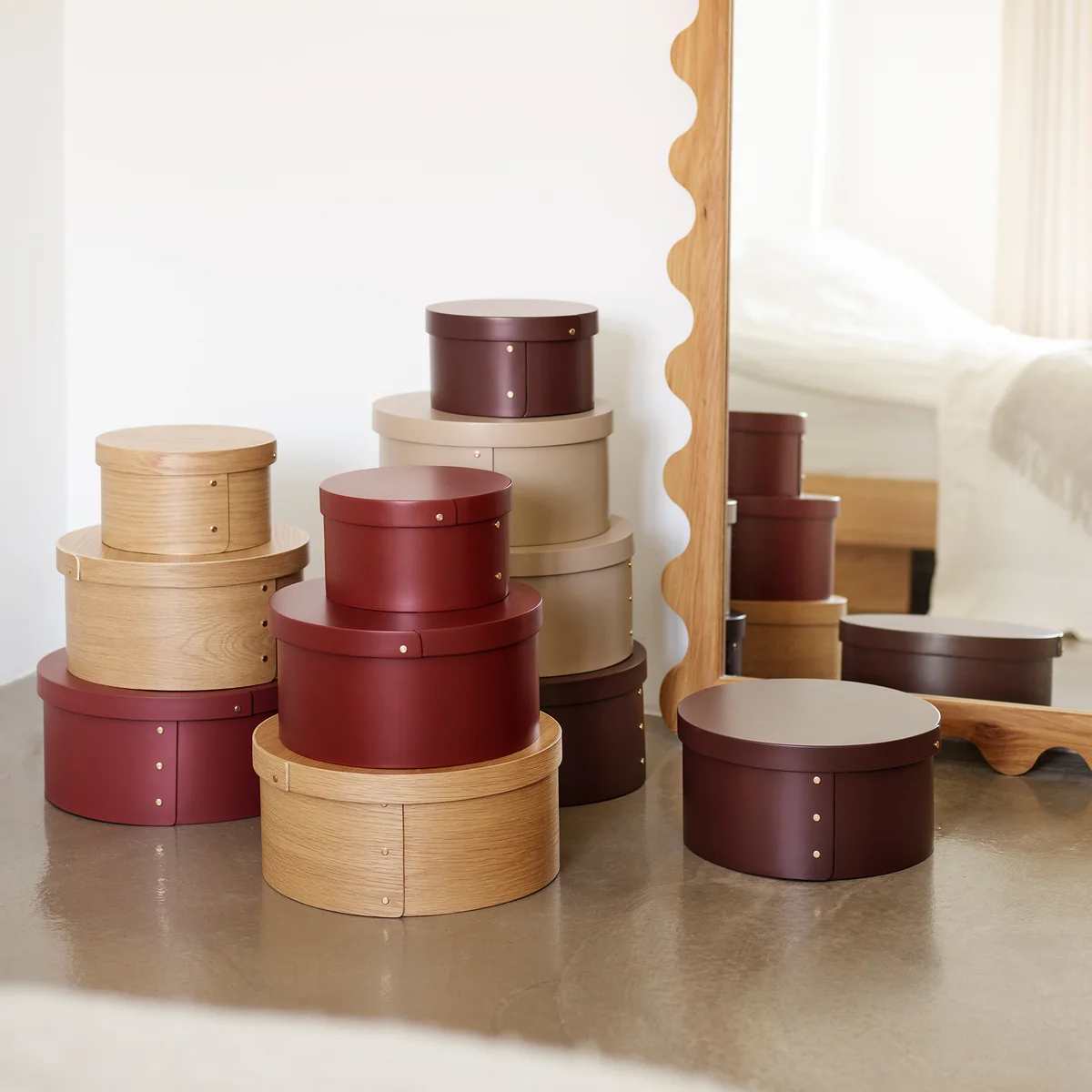 Die Drejø Aufbewahrungsboxen sind inspiriert von der klassischen "Shaker-Box", die ursprünglich von der amerikanischen Shaker-Gemeinschaft entworfen wurde. Diese Gemeinschaft legte grossen Wert auf funktionales, schlichtes Design ohne überflüssige Verzierungen, was viele bedeutende Designer, wie Børge Mogensen, beeinflusste. Die Drejø Aufbewahrungsboxen bieten grosszügigen Stauraum für verschiedenste Gegenstände wie Handarbeiten, Spielzeug, Socken oder persönliche Dinge. Mit ihrer eleganten, runden Form sind sie nicht nur praktisch, sondern auch ein stilvolles Designelement. Erhältlich in mehreren Farben und zusammengehalten von schlichten Messingnieten, können die Boxen vielseitig eingesetzt werden – sei es im Regal, auf dem Boden, gestapelt oder als kleiner Beistelltisch.