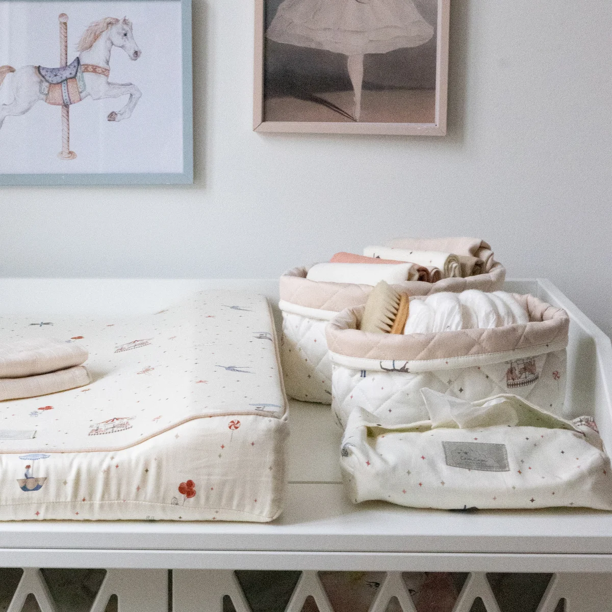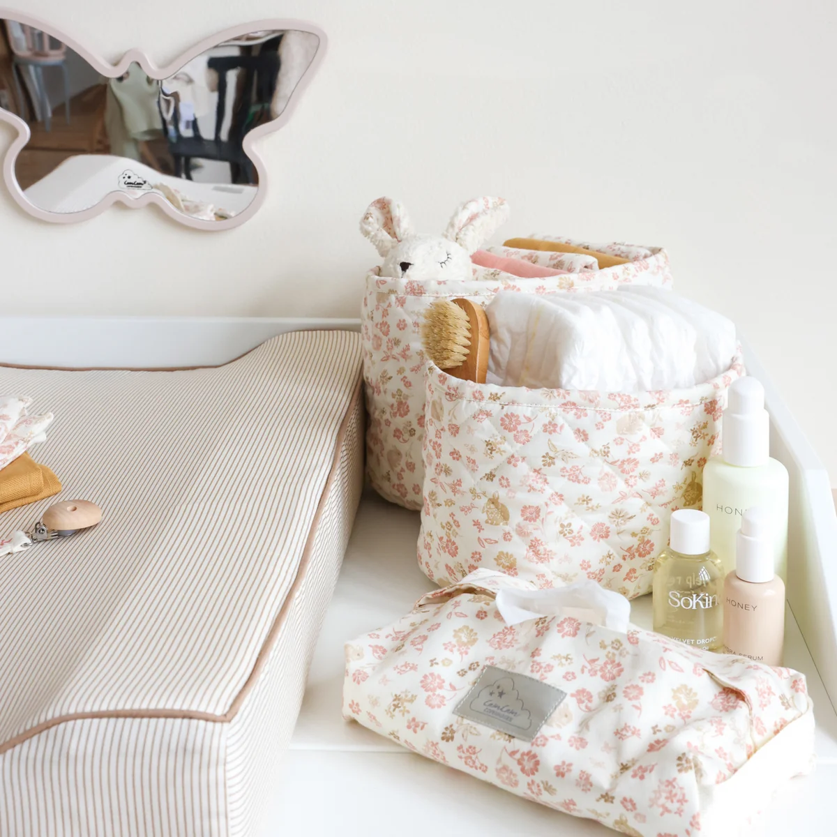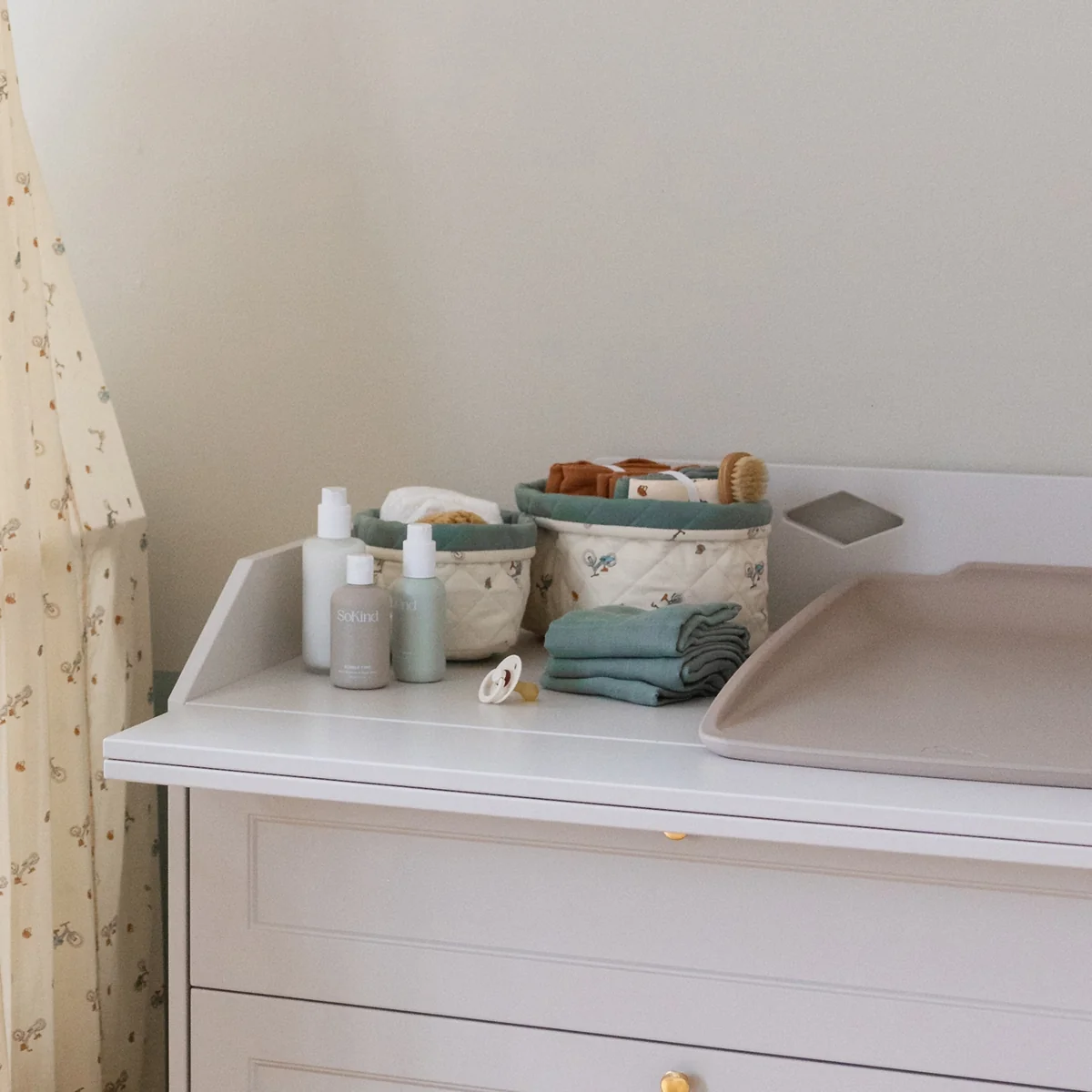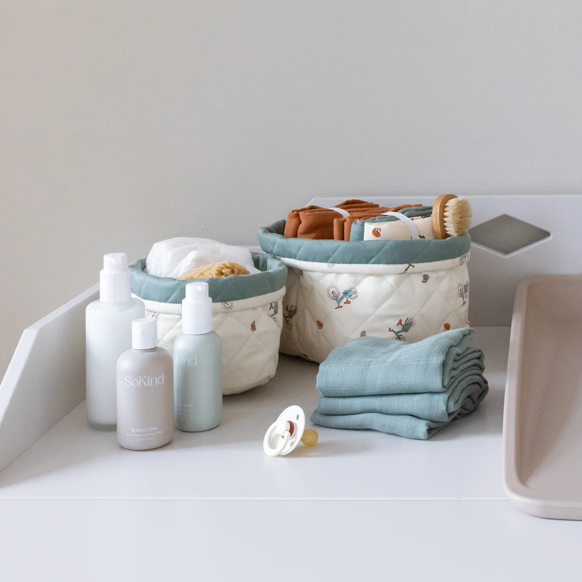 Die gesteppten Aufbewahrungskörbe von Cam Cam Copenhagen sorgen für Ordnung im Kinderzimmer. Vor allem am Wickeltisch bieten die heimisch designten Körbe für Organisations- und Stauraum. Sie sind aus OCS-zertifizierter Bio-Baumwolle gefertigt und präsentiert eine hübsche Steppung, die einen Bohème Touch in die Kinderzimmereinrichtung bringt.