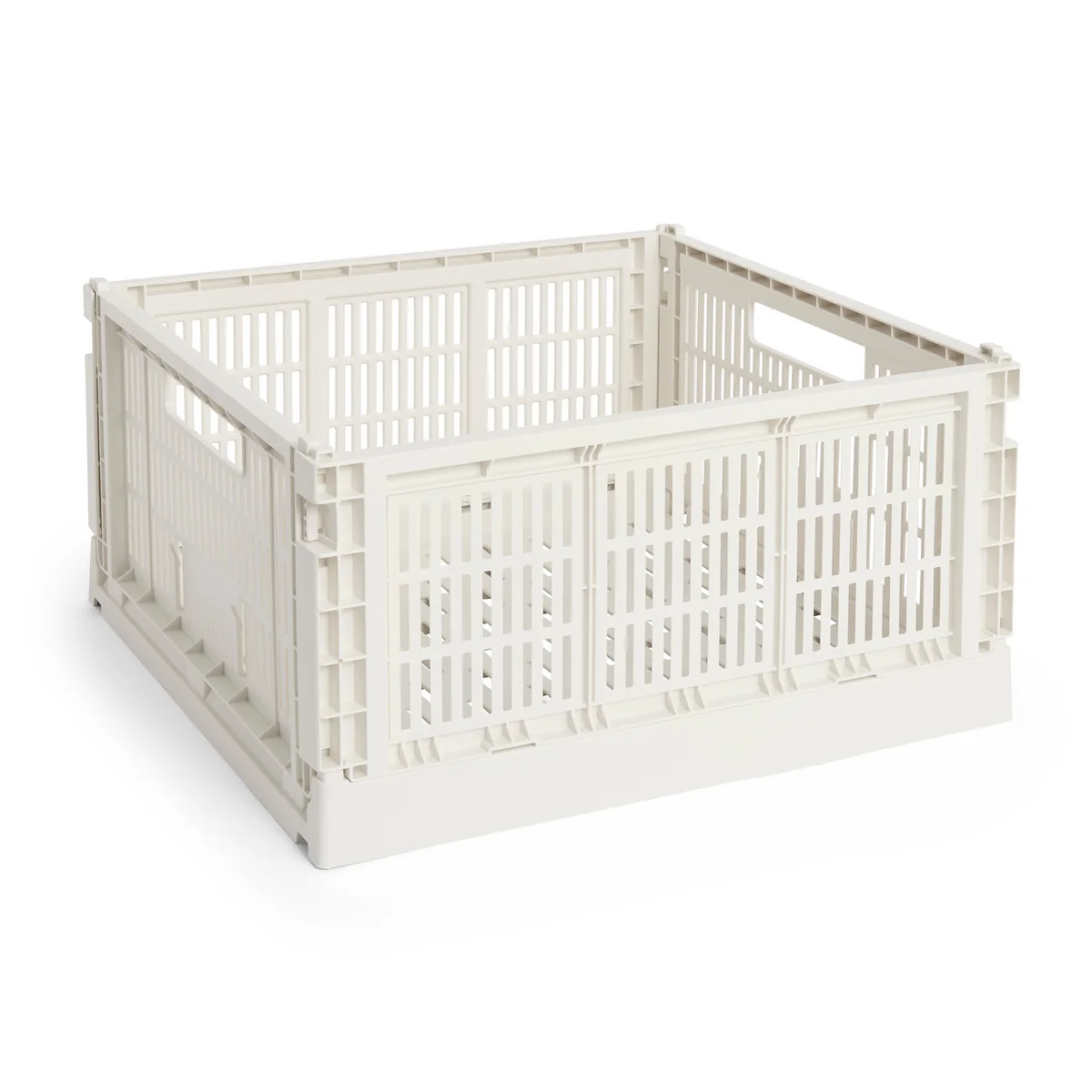 Die HAY Colour Crate Serie bietet funktionale Aufbewahrungslösungen mit ikonischem, perforiertem Design. Gefertigt aus 100 % recyceltem Kunststoff (Post-Consumer Waste), sind die Crates in verschiedenen Grössen und Farben erhältlich – von kubisch bis rechteckig. Dank durchdachter Stapelbarkeit, optionalen Deckeln und Rollen sowie der Möglichkeit zur flachen Faltung bei Nichtgebrauch lassen sich die Kisten flexibel einsetzen – zur Aufbewahrung, Präsentation oder sogar als Teil modularer Möbelideen.