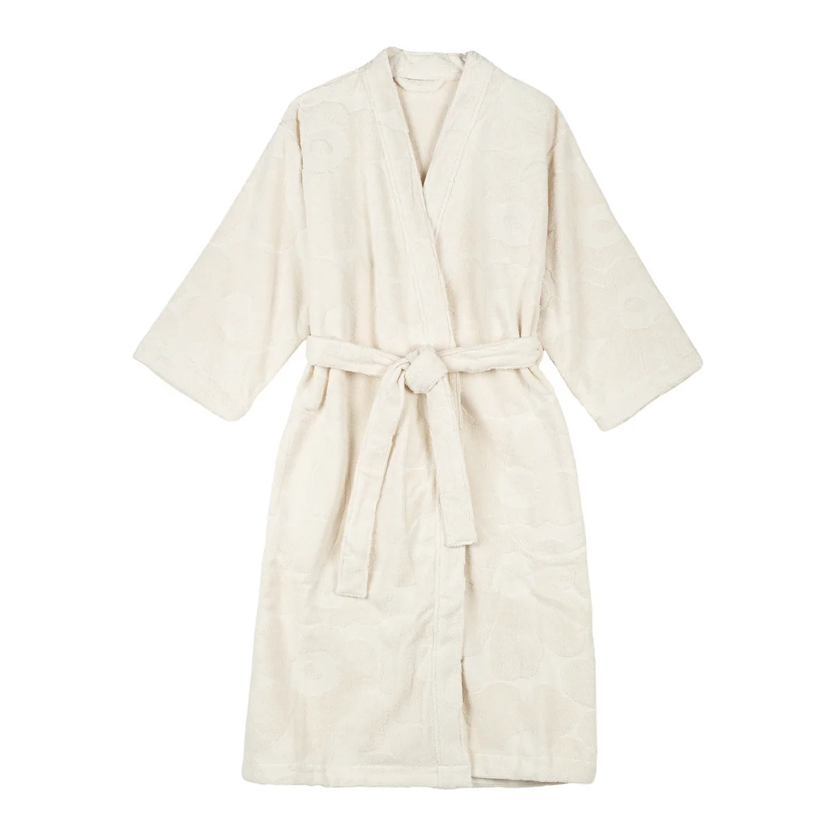 Der Pienni Unikko Bademantel von Marimekko bringt Komfort und ikonisches Design in Einklang. Gefertigt aus weichem Bio-Baumwollfrottee, ist er mit dem berühmten Pienni Unikko Muster verziert, das florale Eleganz und moderne Ästhetik vereint. Der Bademantel verfügt über grosszügige Taschen und einen abnehmbaren Gürtel, der für eine bequeme Passform sorgt.
