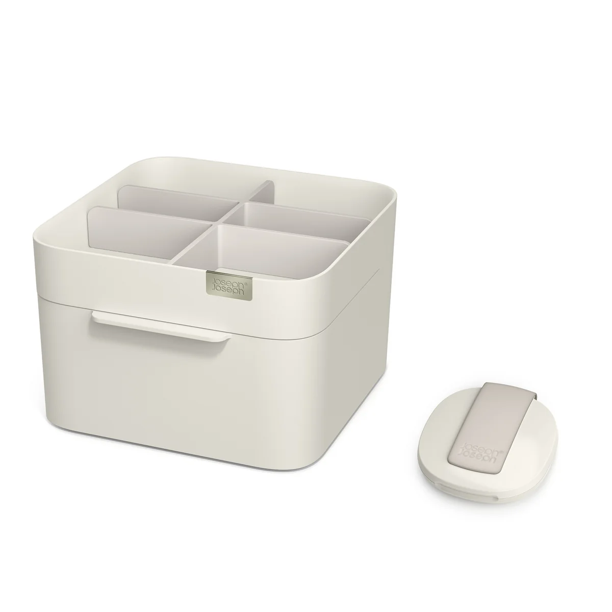 Mit dem Make Me up Set von Joseph Joseph wird Ihr tägliches Schönheitsritual zu einer wahrhaft organisierten und stilvollen Erfahrung. Der Kosmetik-Organizer mit Schublade bietet tiefe Fächer, die perfekt für Pinsel, Wimperntusche und Eyeliner-Stifte geeignet sind, sowie flache Fächer für kleinere Schätze wie Lippenstifte, Rouge und Lidschatten. Die Schublade selbst ist mit einem magnetischen Verschluss ausgestattet, in dem Wattepads, Wattestäbchen und Make-up Schwämme sicher aufbewahrt werden können. Das verchromte Emblem verleiht diesem Organizer einen Hauch von Eleganz, und das Beste daran ist, dass er sich zum Reinigen einfach auseinandernehmen lässt.