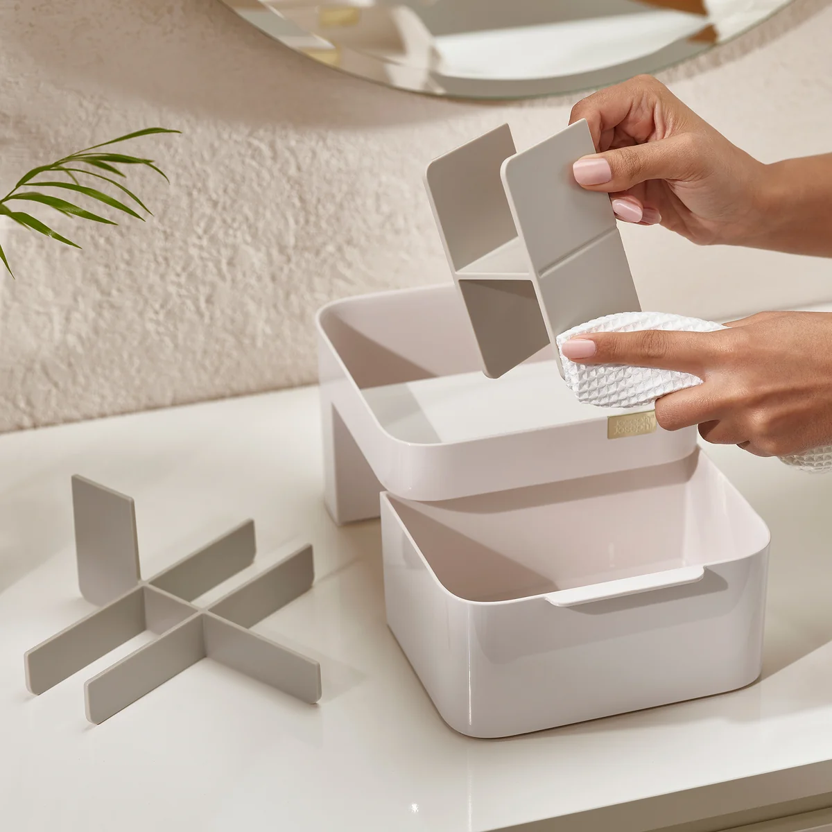 Aber das ist noch nicht alles, was das Make Me up Set zu bieten hat. Der 2-in-1 Kompakte Vergrösserungsspiegel ist ein wahres Highlight. Er verfügt über einen Standard-Spiegel für einen unverzerrten Blick auf das gesamte Gesicht und einen 3-fachen Vergrösserungsspiegel für feinere Details. Ein weicher Silikonriemen mit Aufbewahrungsfunktion ermöglicht es Ihnen, kleine Gegenstände wie Lippenstift oder Wimperntusche in Reichweite zu halten. Der sichere Magnetverschluss sorgt dafür, dass der Spiegel immer geschützt ist. Das Make Me up Set von Joseph Joseph ist die perfekte Kombination aus Organisation und Funktionalität, um Ihr tägliches Schönheitsritual zu perfektionieren.