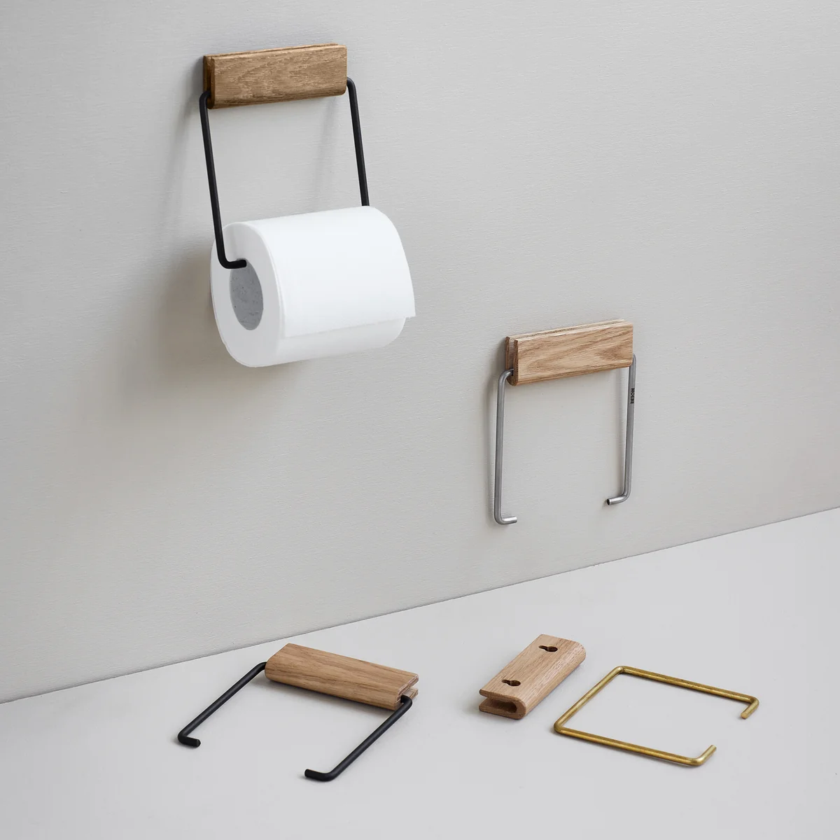 Der Toilettenpapierhalter von Moebe präsentiert sich in einer modernen und blickfangenden Optik. Der Zusammenschluss zweier unterschiedlich beschaffener Materialien schafft eine kontrastive Ästhetik, die schöne Details im Badezimmer setzt. Die Holzhalterung kann ganz einfach an der Wand befestigt werden, während der Metalldraht die Toilettenpapier Rollen souverän trägt. Die zwei Komponenten verleihen dem Halter ein stilvolles Aussehen, das vielseitig kombiniert werden kann.