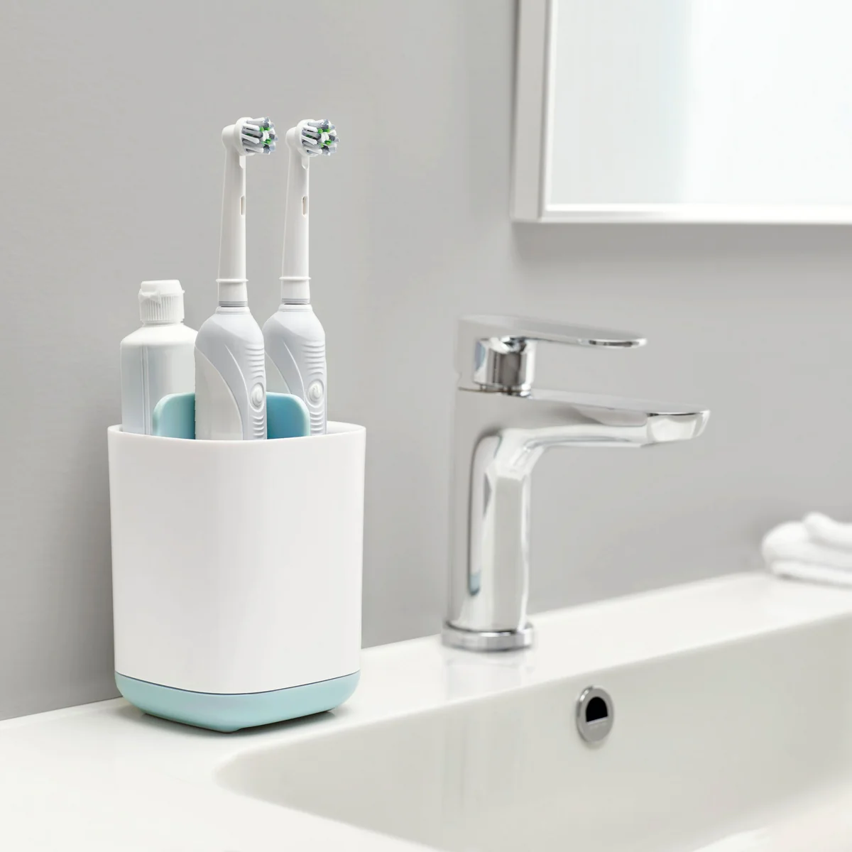 Mit dem Easy Store Zahnbürstenhalter von Joseph Joseph lässt sich auf stilvolle Weise Ordnung im Badezimmer schaffen. Alle Mundpflege-Gegenstände wie Zahnbürste, Zahnpasta und Zahnseide können so an einem Ort aufbewahrt werden und sind stets griffbereit.