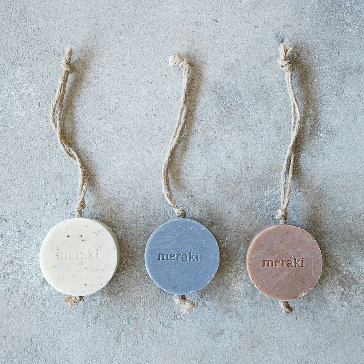 Die runde Seife mit Kordel von Meraki bietet eine sanfte Reinigung der Hände. Erhältlich in unterschiedlichen Ausführungen beispielsweise mit kühlenden-, belebenden- oder Peeling-Effekten.