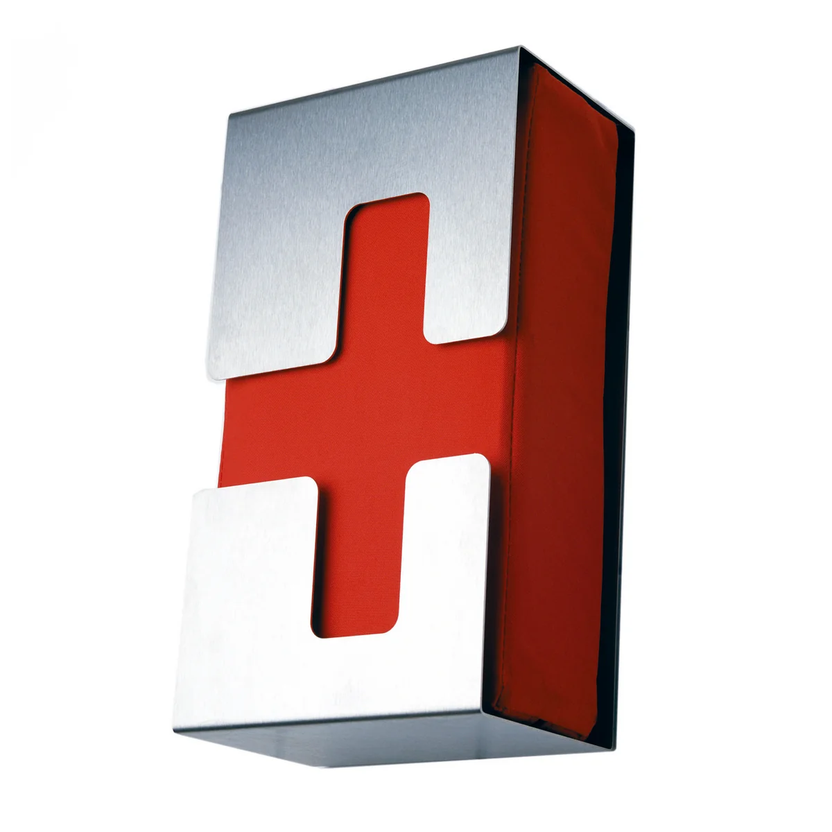 Mit seinem eleganten, symbolhaft gestaltetem Edelstahlgehäuse und signalrotem Kasten ist er ein funktionaler Blickfang und gut aussehender Helfer in der Not.