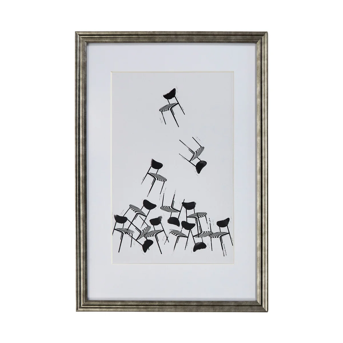 Diese Wandkunst bringt eine spielerische und moderne Note in jeden Raum. Das schwarz-weisse Motiv mit "House Doctor"-Stühlen ist in einem antik-silbernen Aluminiumrahmen mit Passepartout gefasst, wodurch Tiefe und Eleganz entstehen. Die vielseitigen Gestaltungsmöglichkeiten machen das Bild ideal für farbenfrohe Kombinationen oder eine minimalistische Wanddekoration.