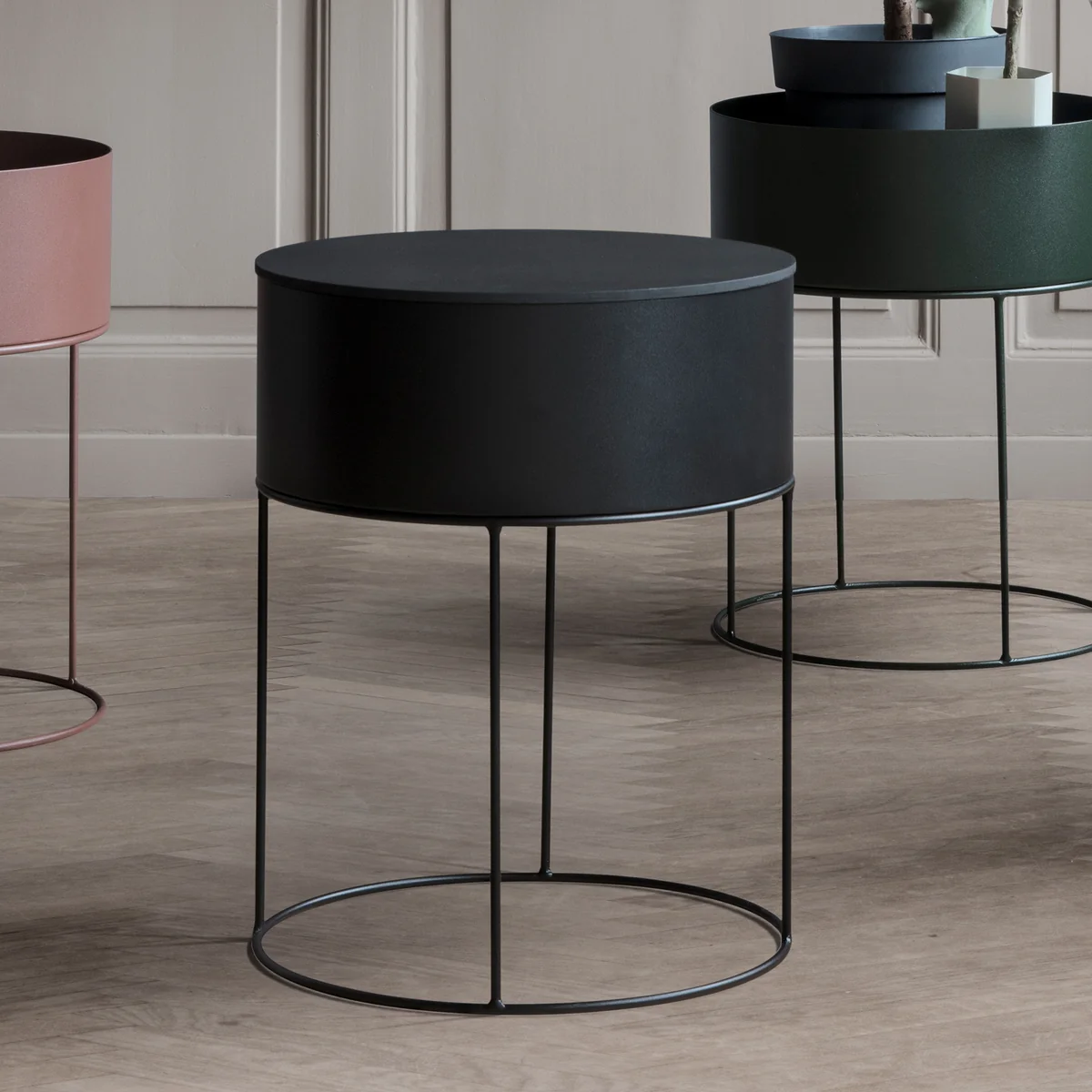 Die Plant Box rund von Ferm Living wird aus pulverbeschichtetem Stahl hergestellt und ist so sowohl für den Innen- als auch Aussenbereich geeignet. Als Pflanzenkasten sorgt man mit der Plant Box für eine grüne Note im Wohnbereich, während in ihr auch Vasen oder Bücher dekorativ präsentiert werden können.