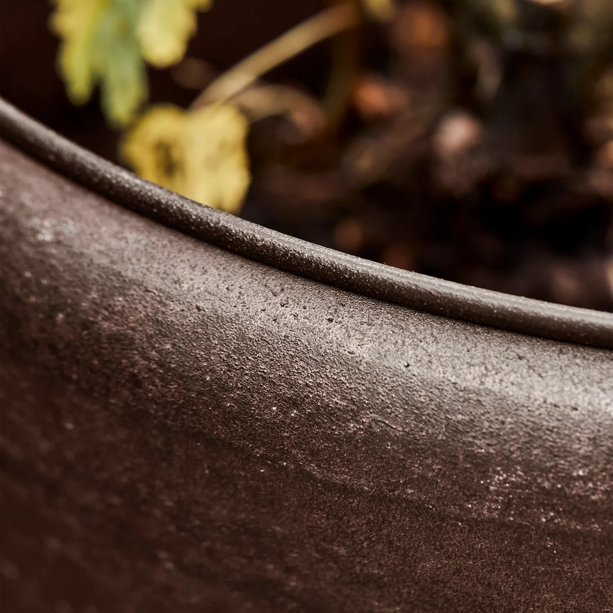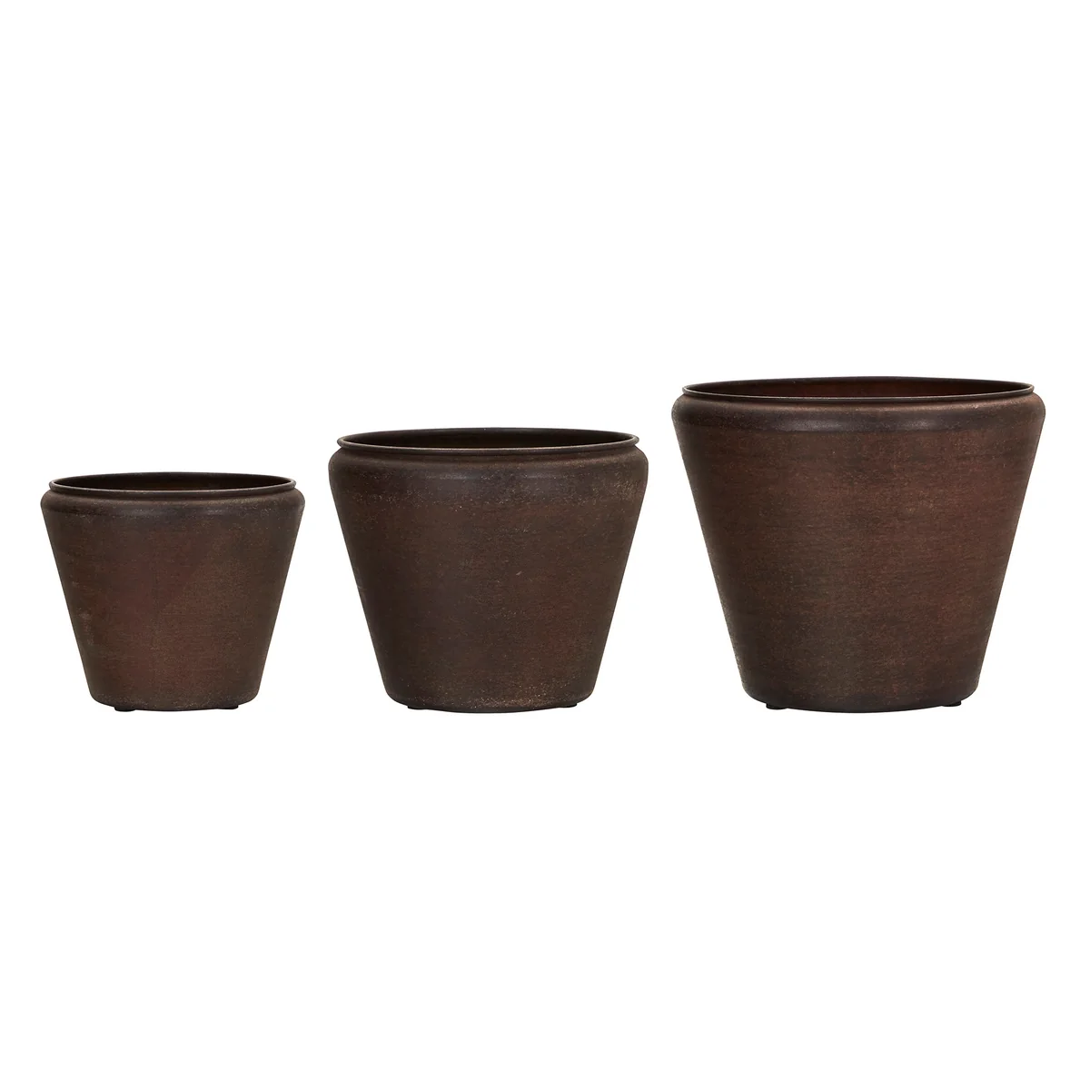 Dieses Set aus drei Blumentöpfen verleiht Terrassen und Balkonen einen modernen und eleganten Look. Die konische Form und die matte, antikbraune Oberfläche setzen Pflanzen und Blumen stilvoll in Szene. Gefertigt aus recyceltem Stahl, kombiniert jeder Topf Nachhaltigkeit mit einzigartiger Textur. Die integrierten Abflusslöcher mit Stöpseln sorgen für eine einfache Handhabung und Vielseitigkeit.