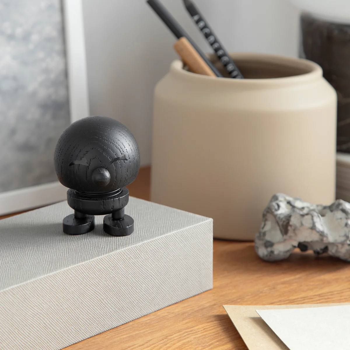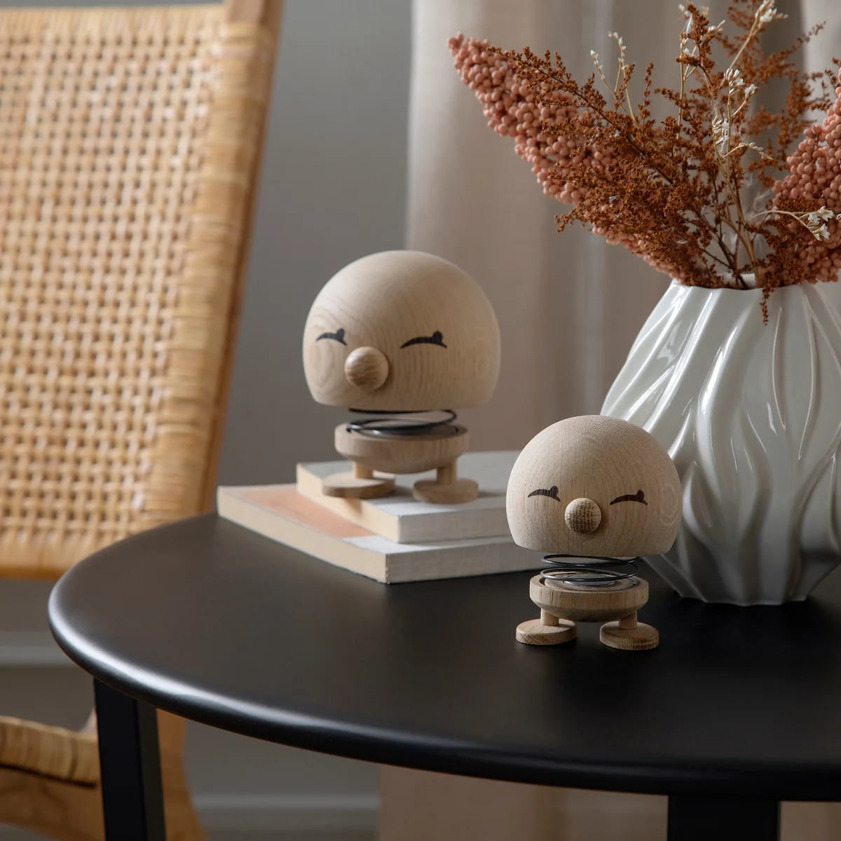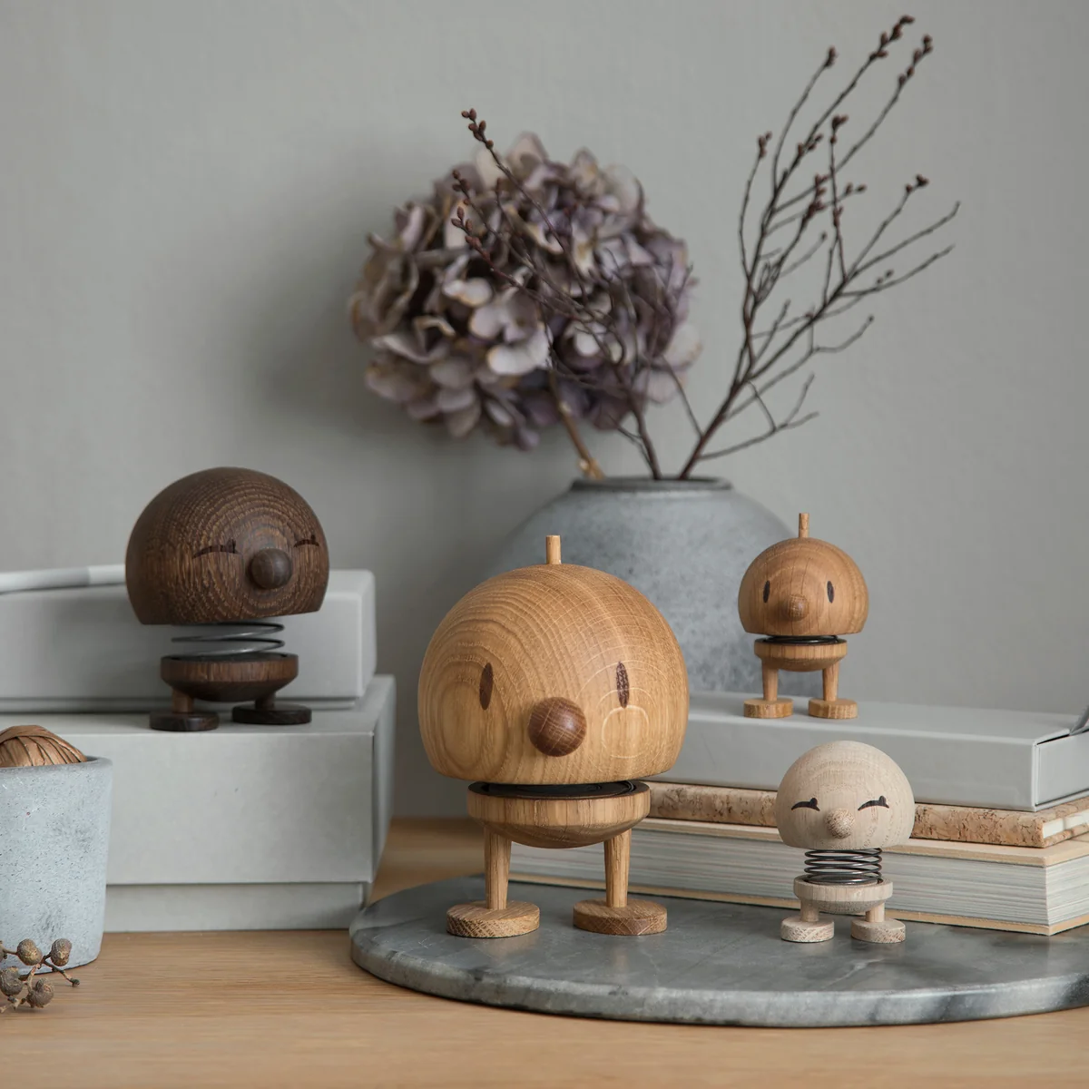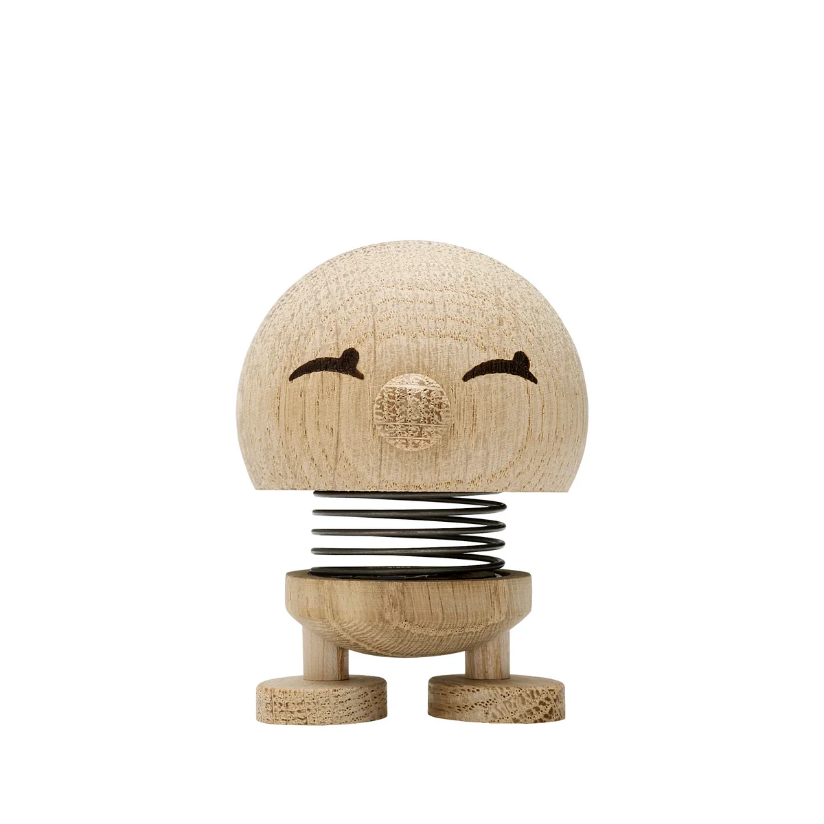 Es handelt sich um ein Stück echtes Kunsthandwerk, ein qualitativ hochwertiges Produkt, das völlig von Hand zusammengebaut wird. Das Eichenholz stammt aus nachhaltigen europäischen Wäldern. Das Naturmaterial verleiht jedem einzelnen Hoptimisten sein unverwechselbares Aussehen. Ein besonderes Detail: Die Augen sind als Intarsien aus Wengéholz eingearbeitet und verleihen der Figur ihre Lebendigkeit.