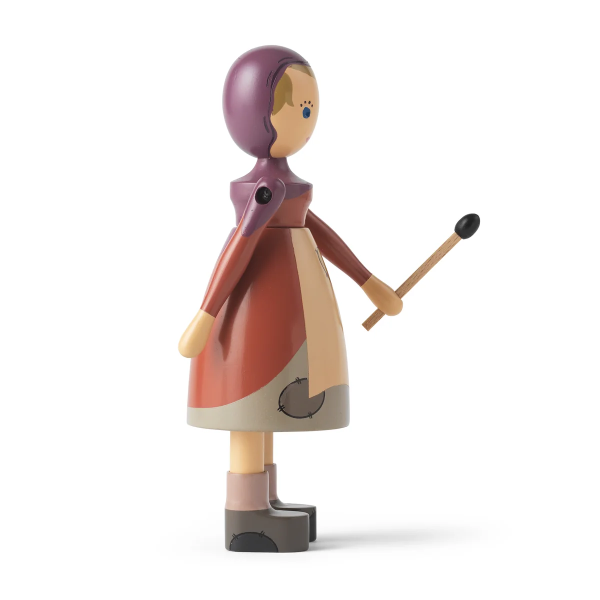 "Das Mädchen mit dem Schwefelhölzchen" ist aus hochwertigem Holz gefertigt und besticht durch die feinen Details und die liebevolle Handbemalung. Die Figur zeigt das kleine Mädchen, gekleidet in einem traditionellen Mantel und Schal, das ein Schwefelhölzchen in den Händen hält. Die sanften Linien und die charakteristischen, runden Formen spiegeln den unverwechselbaren Stil von Kay Bojesen wider und verleihen der Figur eine zeitlose Eleganz.