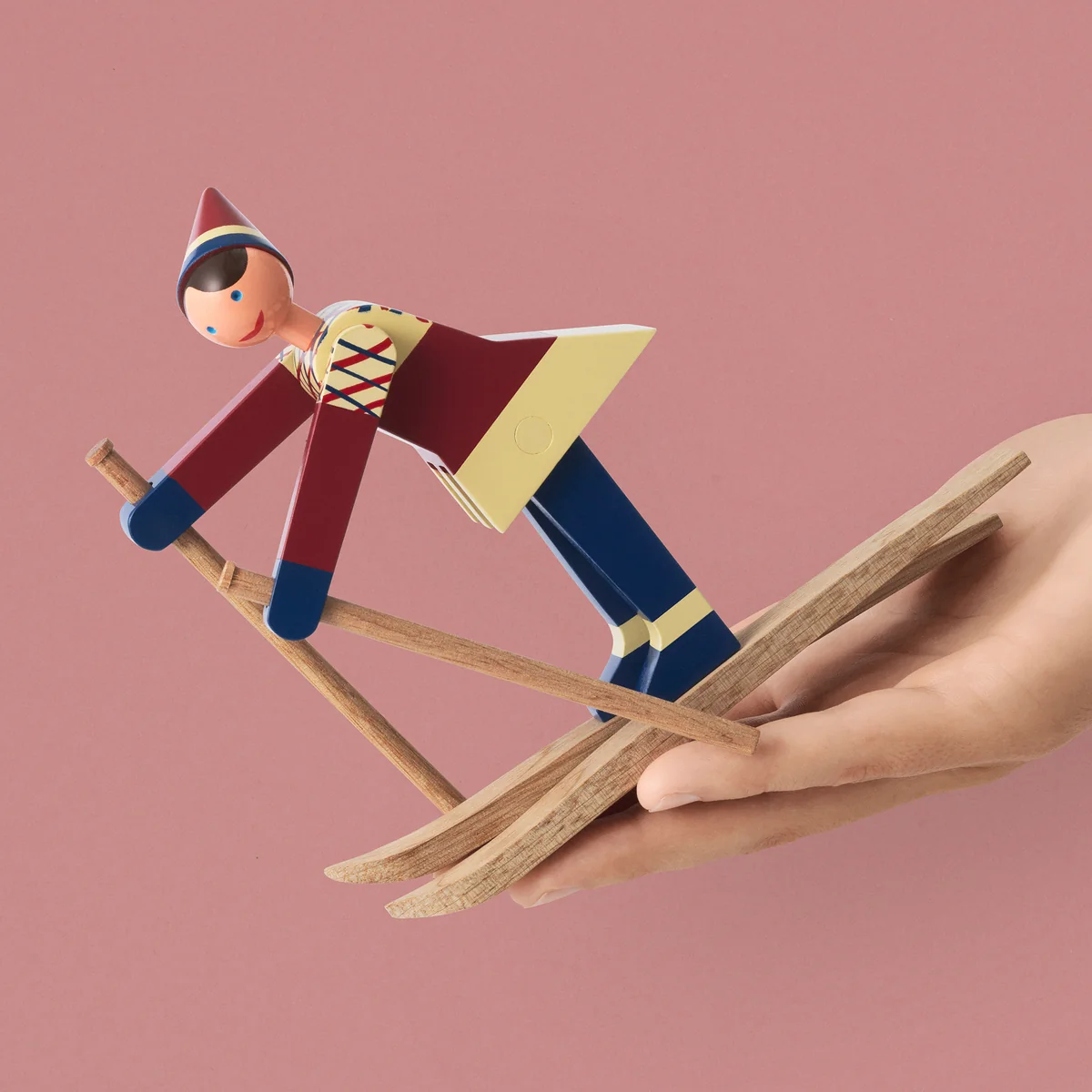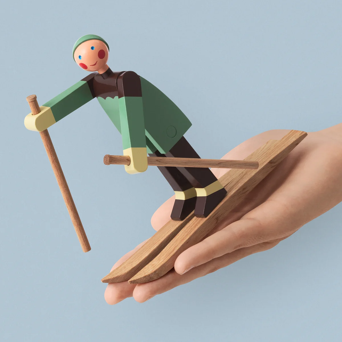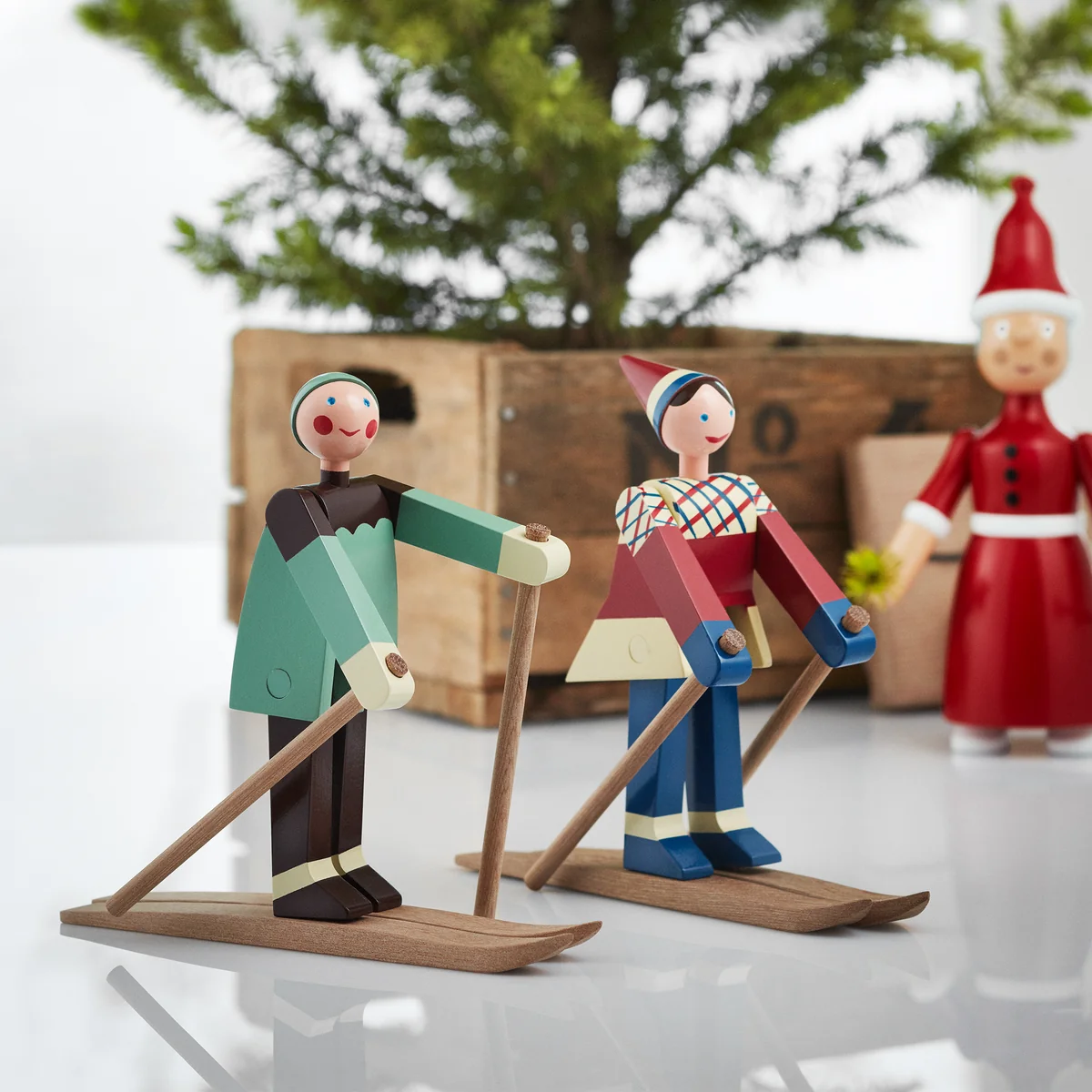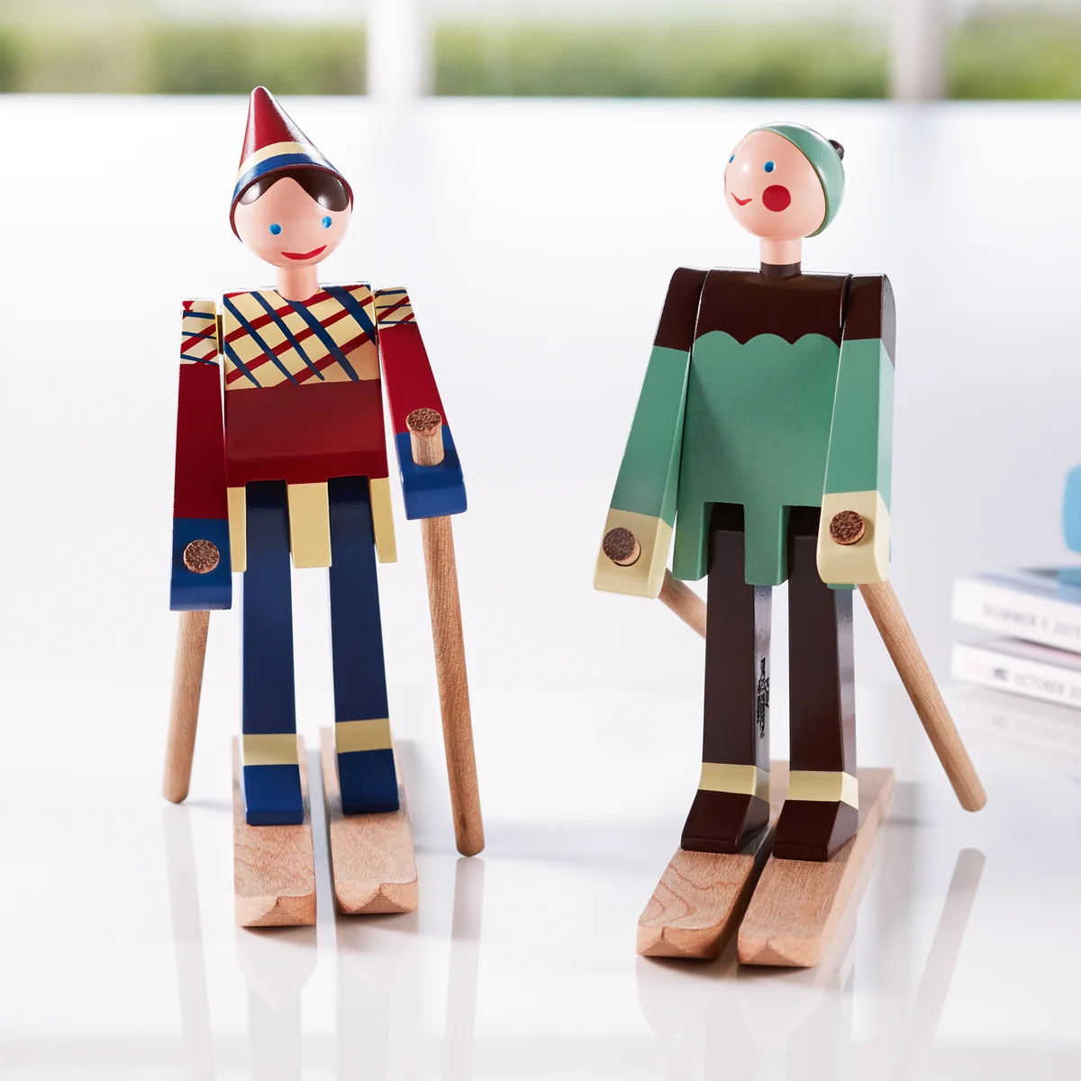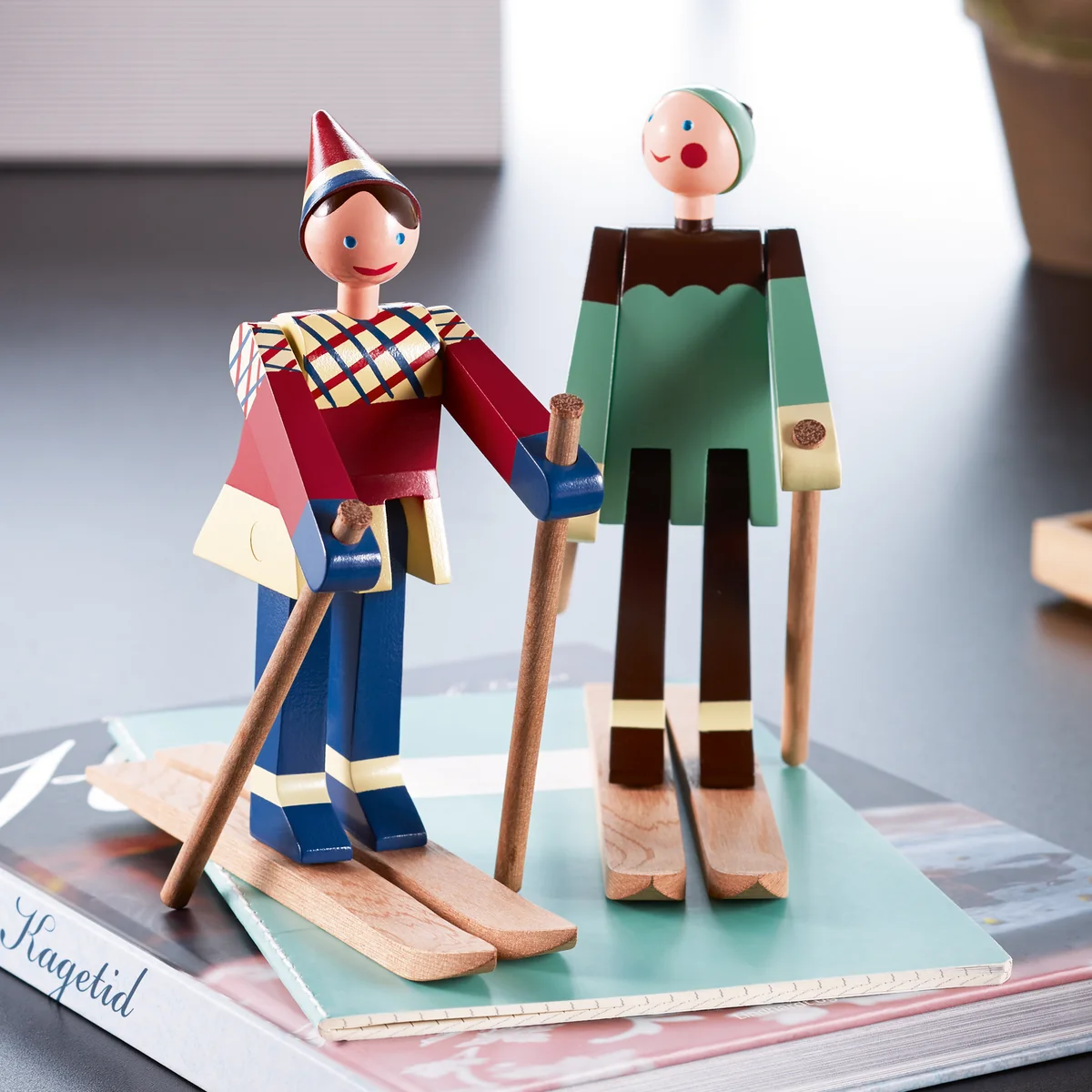 Die Skiläufer von Kay Bojesen sind eine Neuauflage des niedlichen Designs vom dänischen Designer aus den 1940er-Jahren- und flitzen schon bald in Ihr Wohnzimmer! Der mit roter Mütze und karierter Jacke heisst Boje, benannt nach dem Spitznamen von Kay Bojesens Sohn Otto. Seine Kollegin trägt den Spitznamen von Ottos Frau Ruth – Datti. Die beiden frechen Skiläufer wurden ursprünglich nur in kleinen Serien hergestellt, weshalb die ursprünglichen Holzfiguren heute echte Raritäten sind. Die Neuauflage des Skiläufers besteht aus bemalter Buche.