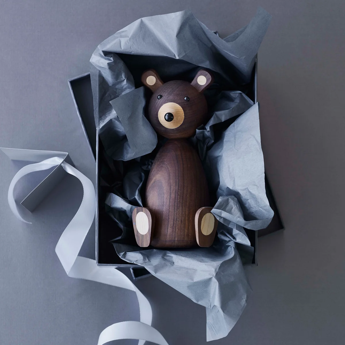 Die Bärenfiguren werden aus amerikanischem Nussbaum mit hellen Details an den Ohren, an der Nase und an den Füssen hergestellt. Durch die klassische Form und das hochwertige Material sind die Bären echte Designobjekte, die ihren Besitzer ein Leben lang begleiten können.