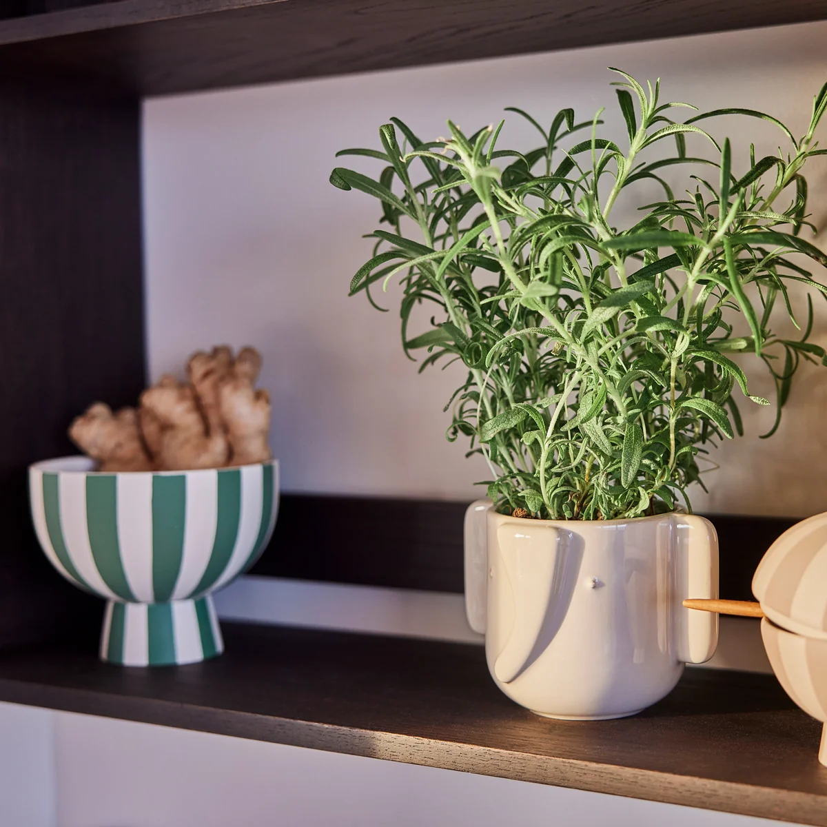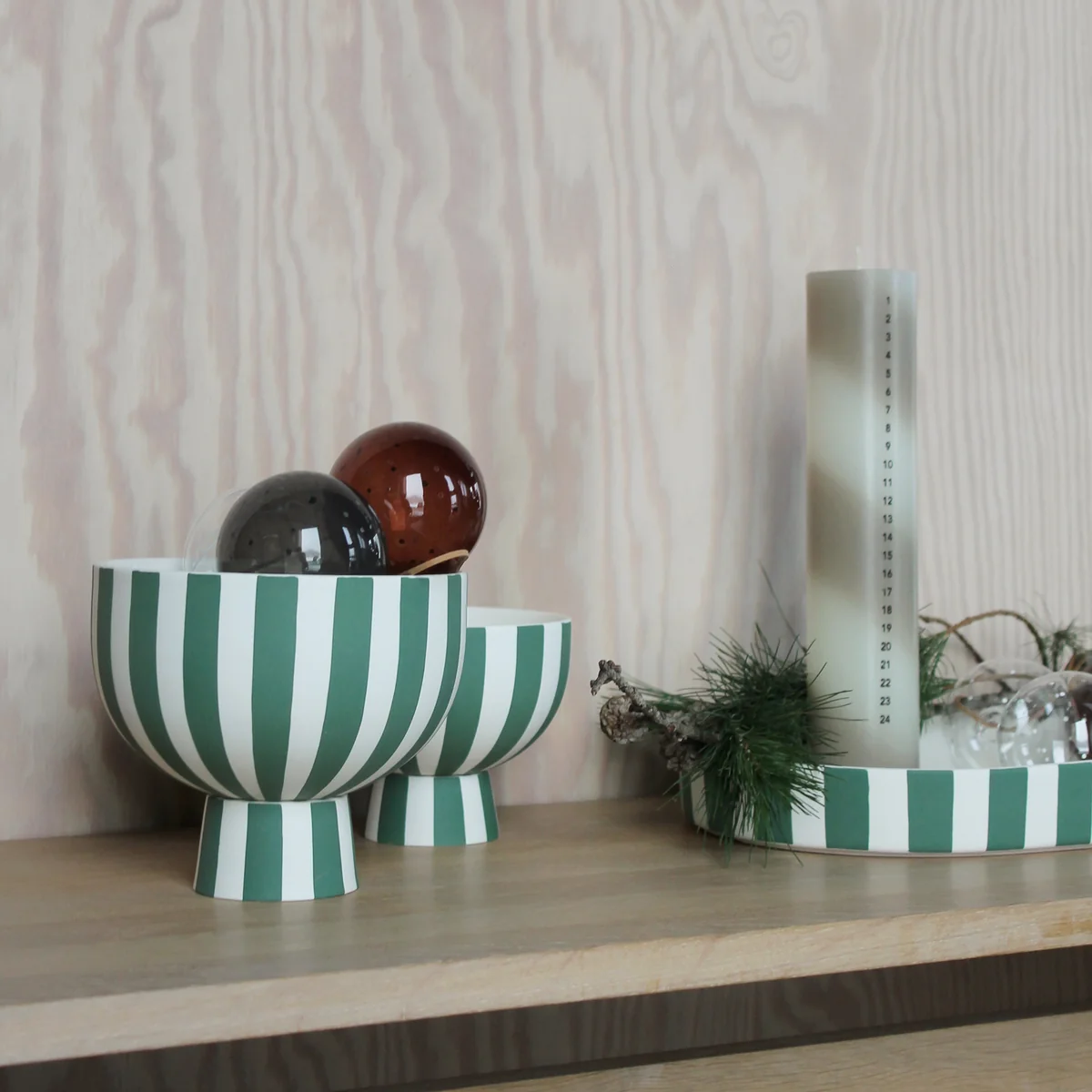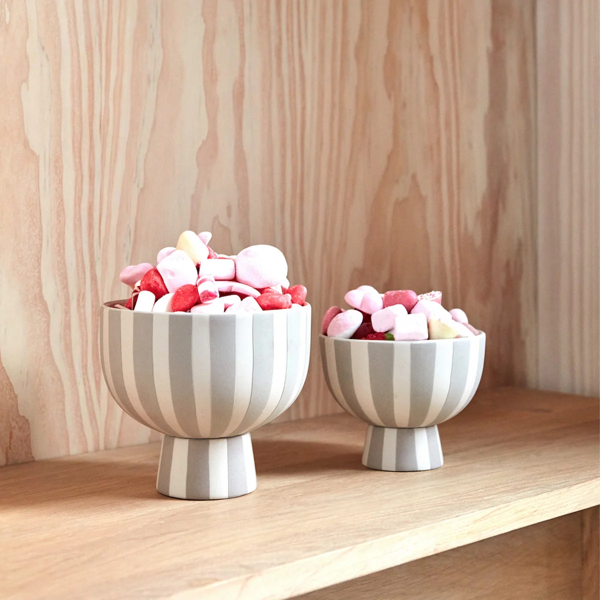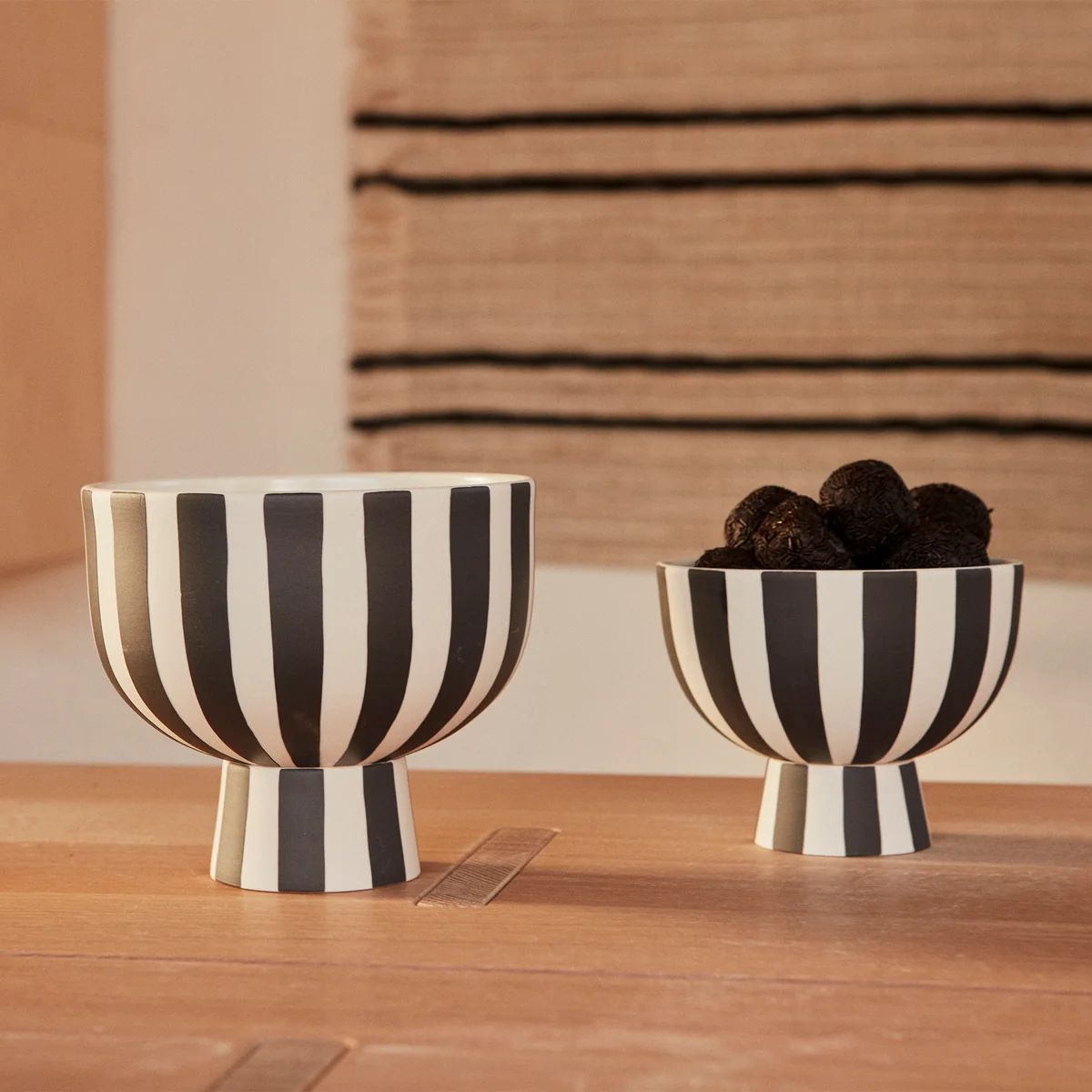 Die Toppu Schalen mit Fuss vereinen zeitlose Eleganz mit markanter Streifenoptik. Hergestellt aus 100% handgefertigter Keramik, setzen sie ein stilvolles Statement in jedem Interieur. Sie sind ideal als dekorative Schale, Blumentopf oder zum Servieren von Obst und Snacks, da sie lebensmittelecht sind.