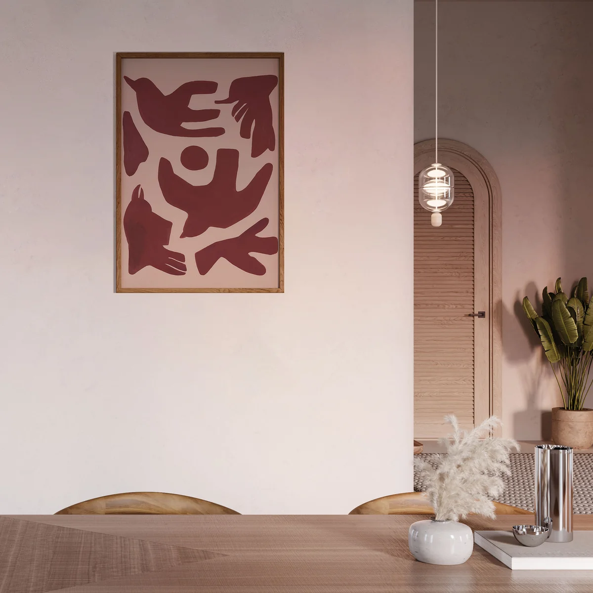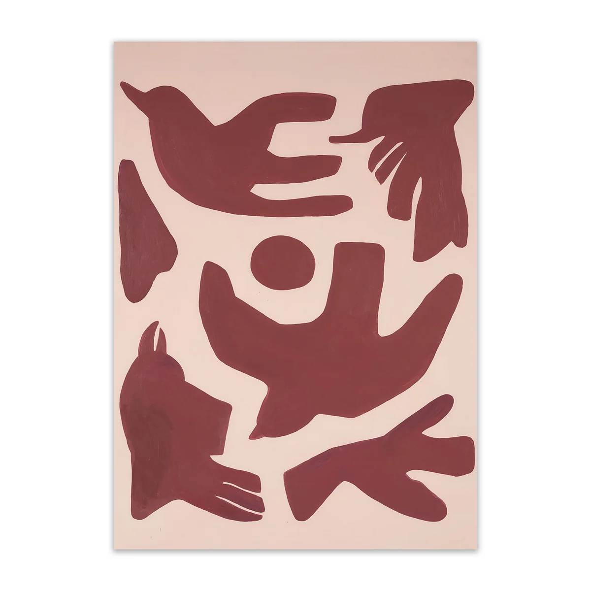 Das Flying High Poster der Niederländerin Anne Olde Kalter für Paper Collective ist vom hohen Himmel und den weiten Landschaften ihrer Heimat inspiriert. Flying High ist kühn und poetisch zugleich. Vor einem seichten, erdigen rosa Hintergrund kreisen abstrakte Vögel in einem tiefen Kastanienbraun über die Komposition. Das Werk sorgt für einen balancierten Touch - es ist nämlich leicht und dennoch geerdet. Die Kombination der Farben und Formen hingegen lassen ein Gefühl von Schwerelosigkeit und Stärke entstehen.