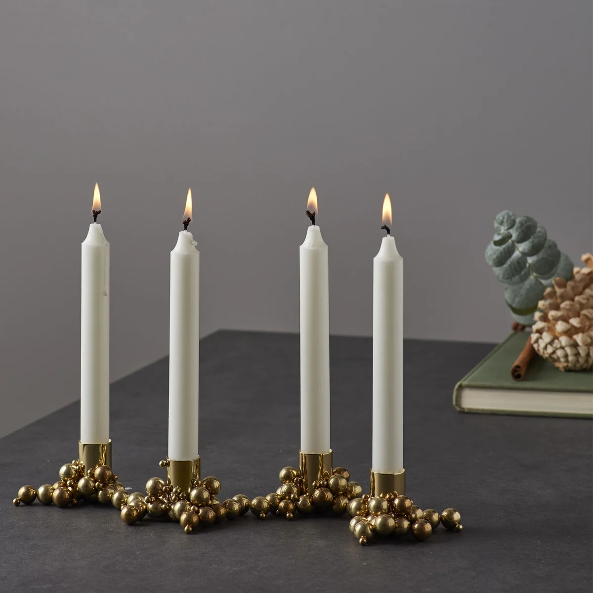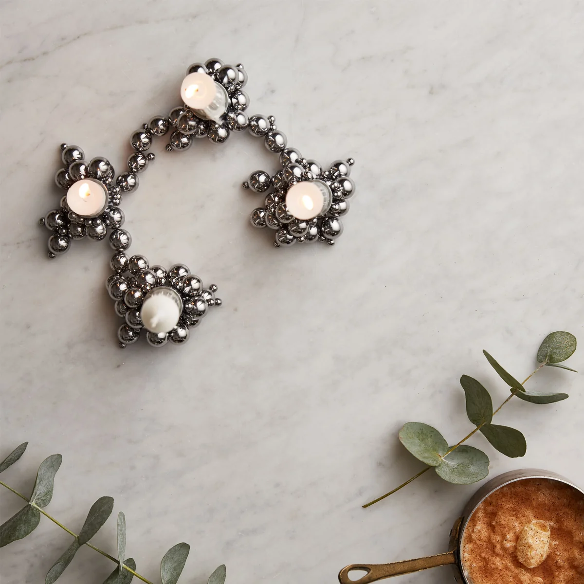 Jeder Kerzenhalter wird mit 20 grossen und 20 kleinen Stahlkugeln geliefert. Dank der unendlichen Möglichkeiten, die Kugeln individuell anzuordnen, gleicht kein Molekyl Kerzenhalter dem anderen.