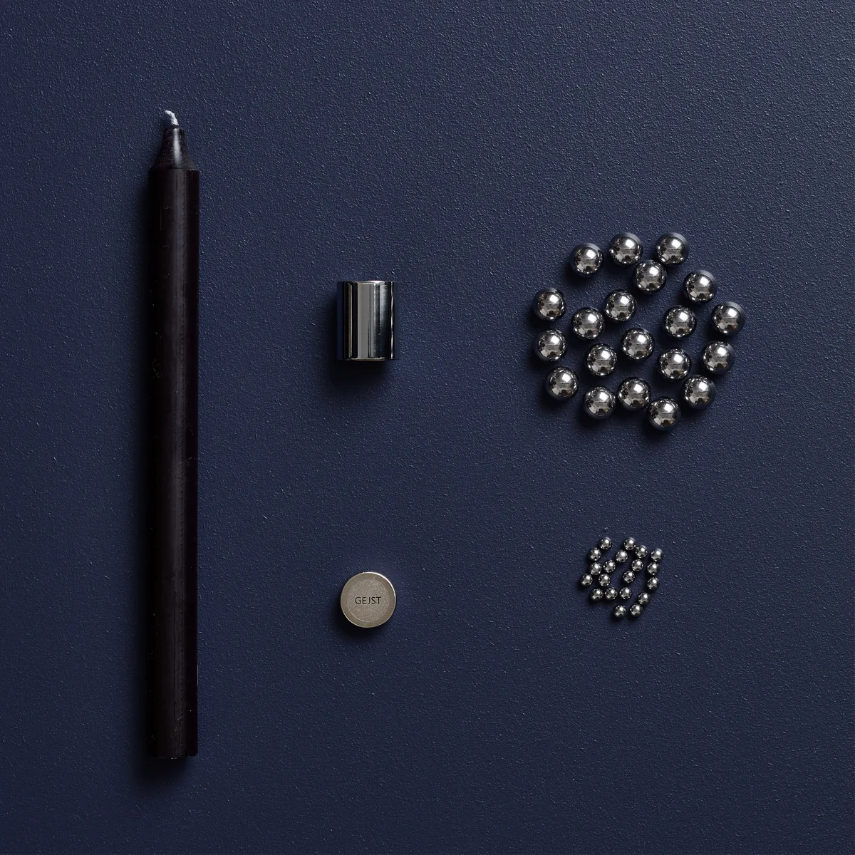 Der Molekyl Kerzenhalter besteht aus einem Metallrohr für die Stabkerze, einer Magnetkugel sowie zahlreichen Stahlkugeln und ist ein einzigartiges Dekorationsobjekt, das mit Materialien, Formen und Individualität spielt. Das endgültige Design von Molekyl ist unvollendet und wird vom Nutzer persönlich bestimmt.