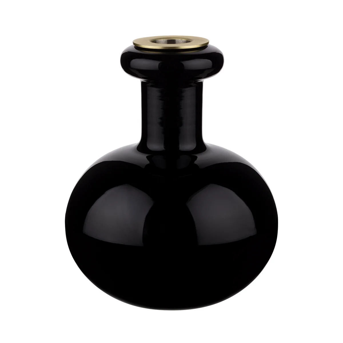 Der Butticula Kerzenhalter von Marimekko erinnert mit seiner bauchigen Form und dem Metalleinsatz an der Öffnung an ein Fläschchen für geheimnisvolle Elixiere. Entworfen wurde er von Carina Seth-Andersson.
