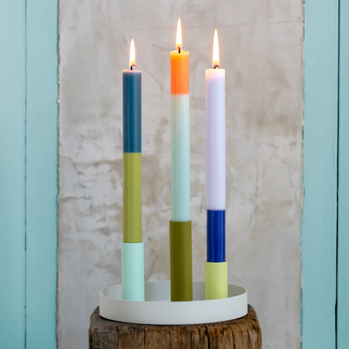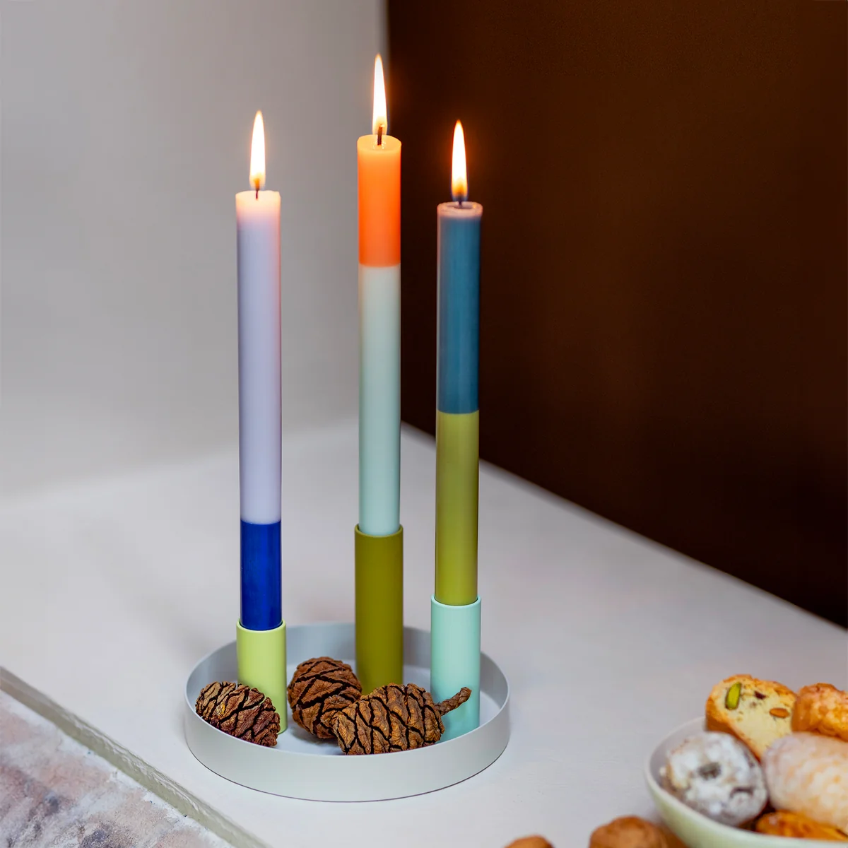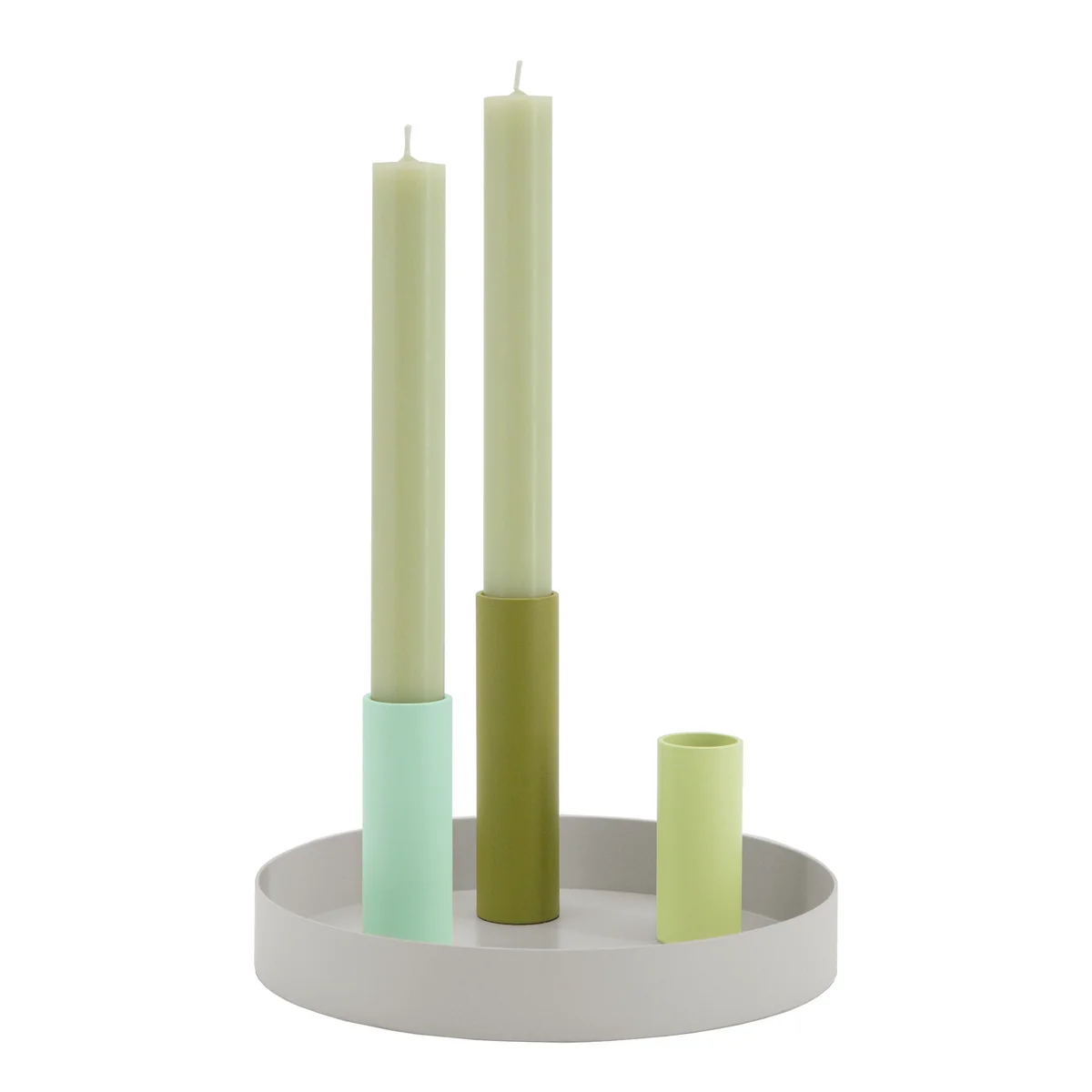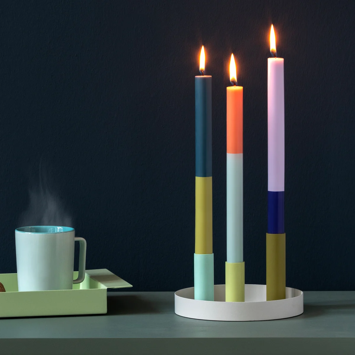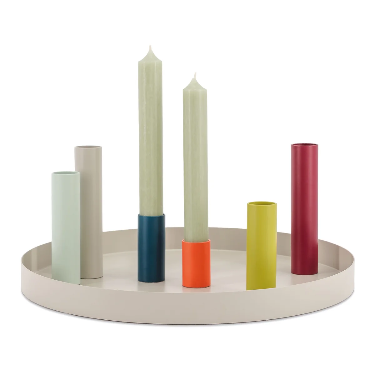 Der magnetische Kerzenhalter von Remembar präsentiert ein rundes dekoratives Tablett mit 6 runden Kerzenhaltern in unterschiedlichen Grössen und Farben. Die Kerzenhalter können nach individuellem Bedürfnis platziert und immer neu arrangiert werden. Das Set schafft somit ein gesamtes Arrangement, das an die Einrichtung angepasst werden kann. Die Kerzenhalter können geziert werden mit Stabkerzen in unterschiedlichen Farben und Längen.