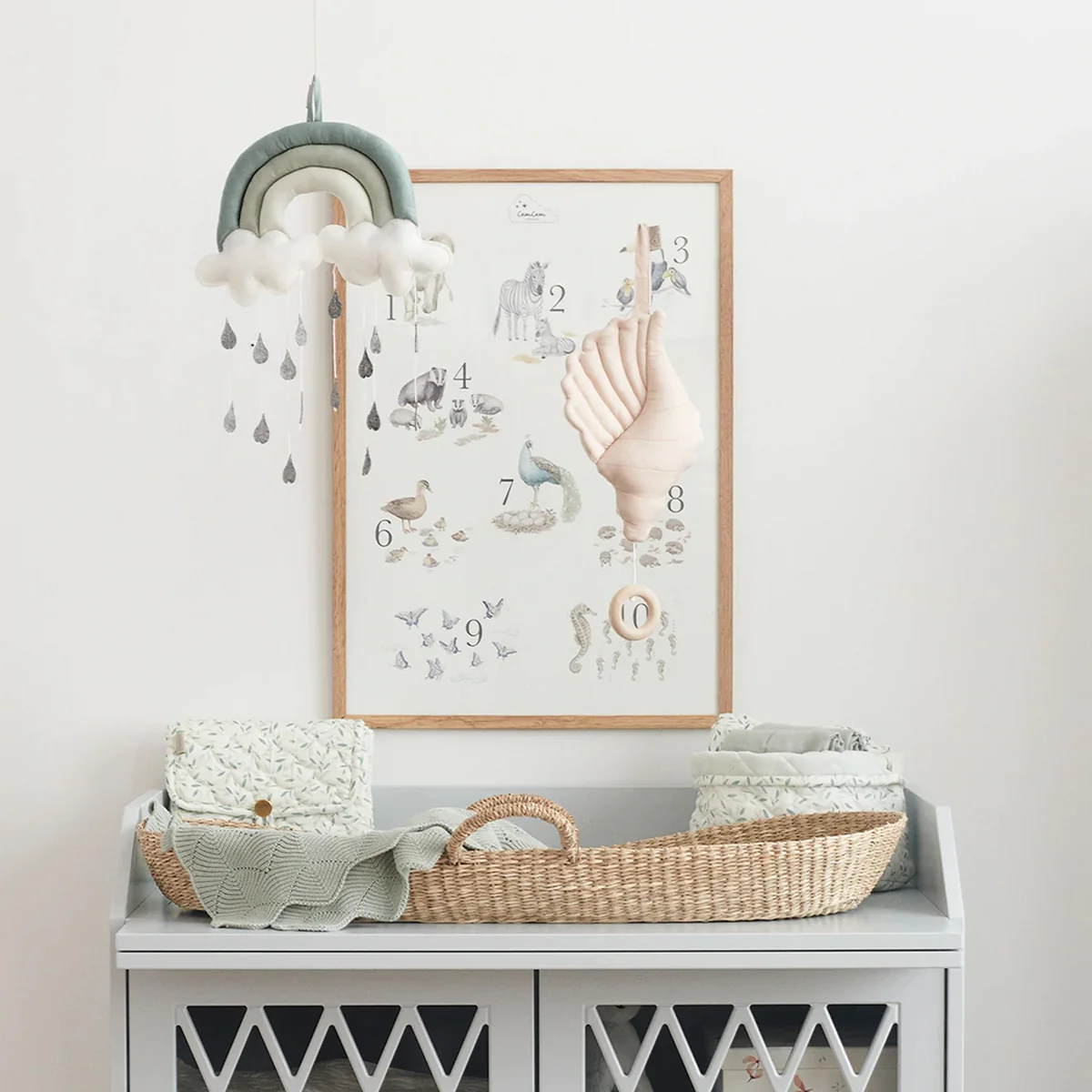 Das Regenbogen Mobile des dänischen Herstellers Cam Cam Copenhagen begeistert mit seinem entzückenden Design. Es kann je nach persönlicher Präferenz über dem Kinderbett oder dem Wickeltisch aufgehängt werden. Der traumhafte Regenbogen wird aus einem Materialmix aus Bio-Baumwolle und Polyester nach Öko-Tex-Standard gefertigt. Er ist von niedlichen Regentropfen aus Filz umgeben, die bei leichten Bewegungen sanft hin und her schwingen. Da es sich bei dem Regenbogen Mobile um einen handgefertigten Artikel handelt, kann es zu leichten Produktabweichungen kommen - jedes Mobile ist ein Unikat.