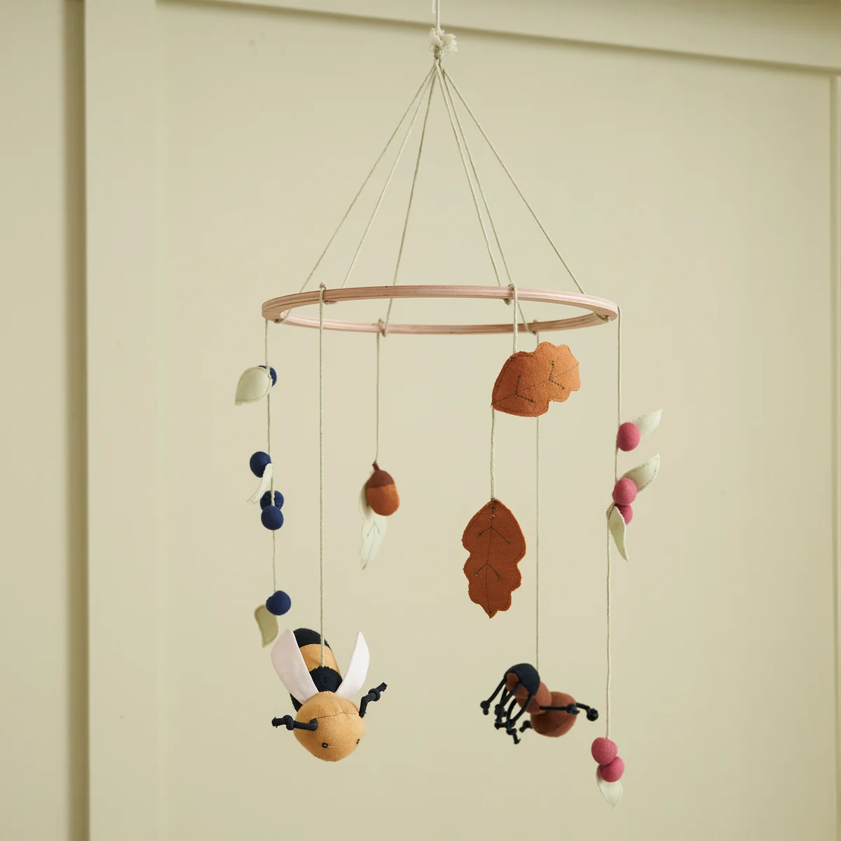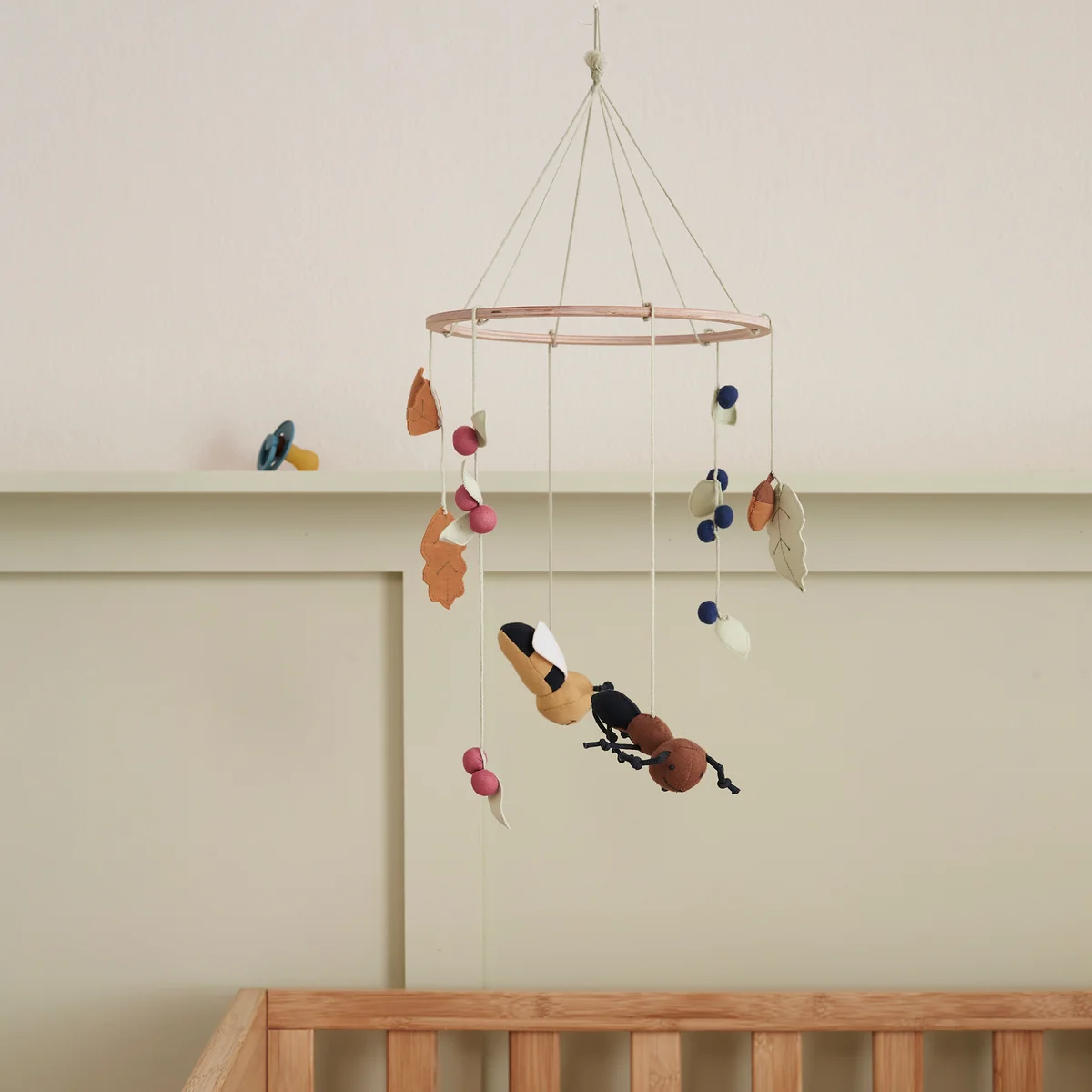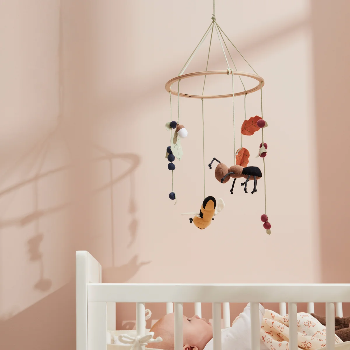 Sowohl die Biene als auch die Ameise lehnen sich leicht nach vorne, damit das Kind ihre Gesichter besser sehen kann. Die Kontraste zwischen den Farben, den Beeren und den Blättern sowie den Tieren und ihren Beinen geben den Kleinen auch die Möglichkeit, ihre Augenfokussierung zu üben.