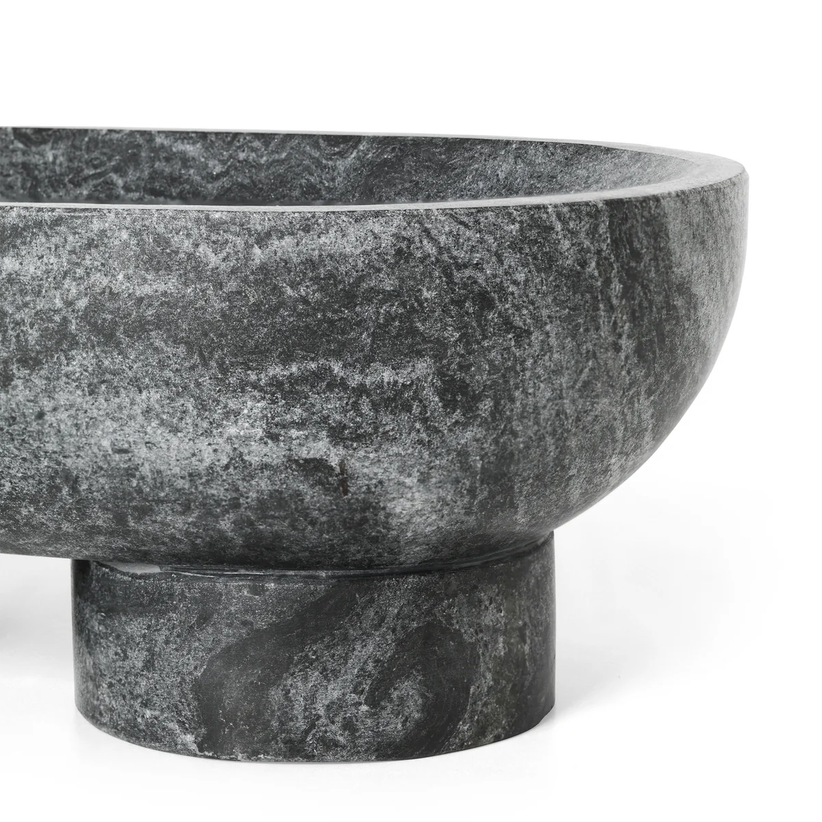 Hergestellt wird die Schale aus schwarzem Selvaras Marmor aus Indien oder aus indischem Banswara Marmor in Weiss. Das Material und die Form der Schale vereinen schwere und leichte Kontraste miteinander und lassen eine Marmorschale entstehen, die sich dekorativ in Küche oder Wohnzimmer macht. In der Schale lassen sich Gebäck oder Süssigkeiten schön servieren oder auch Schlüssel oder Büroklammern auf dekorative Weise aufbewahren.