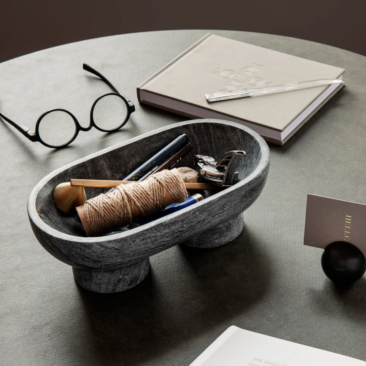 Die Alza Schale von Ferm Living interpretiert die klassische Form der Schale neu. Ihre längliche Form und die zwei Füsse machen die Schale zu einem dekorativen Accessoire im Wohnbereich.