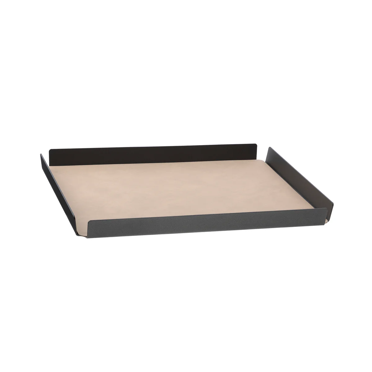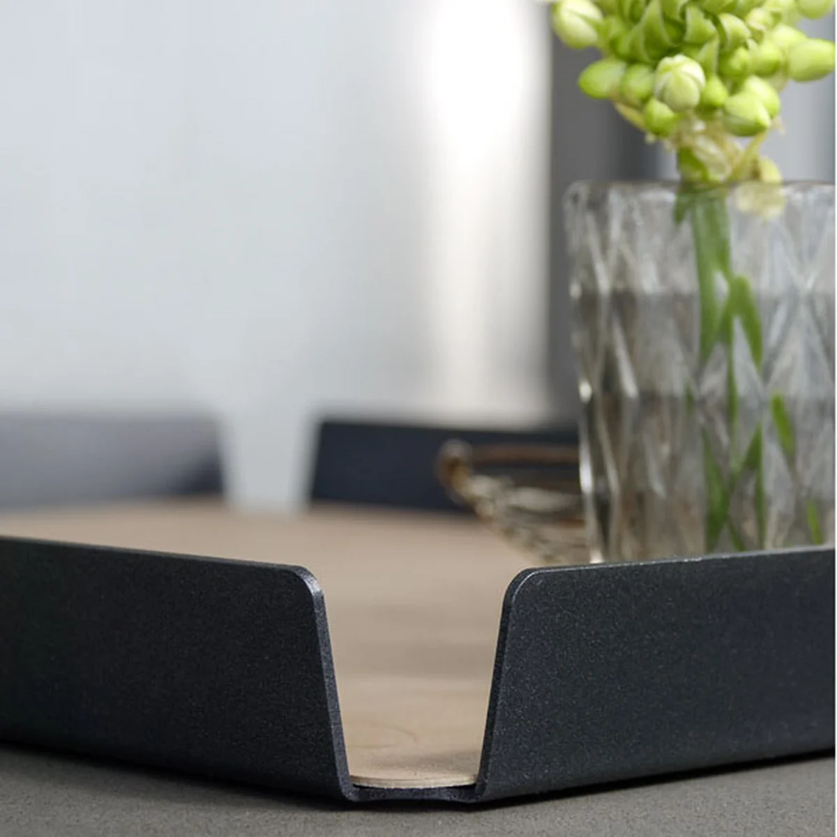 Dieses Tablett von Lind DNA ist ein stylishes und zu gleich praktisches Accessoire. Gefertigt aus Aluminium, mit einer Einlage aus recyceltem Leder, eignet sich das Tray Square Tablett hervorragend als Serviertablett. Hier fällt ganz sicher nichts mehr auf den Boden, die rutschfeste Leder-Einlage hält alles da, wo man es hingestellt hat und selbst wenn mal etwas ins Rollen kommt, wird es von den Aluminiumwänden im Zaun gehalten.