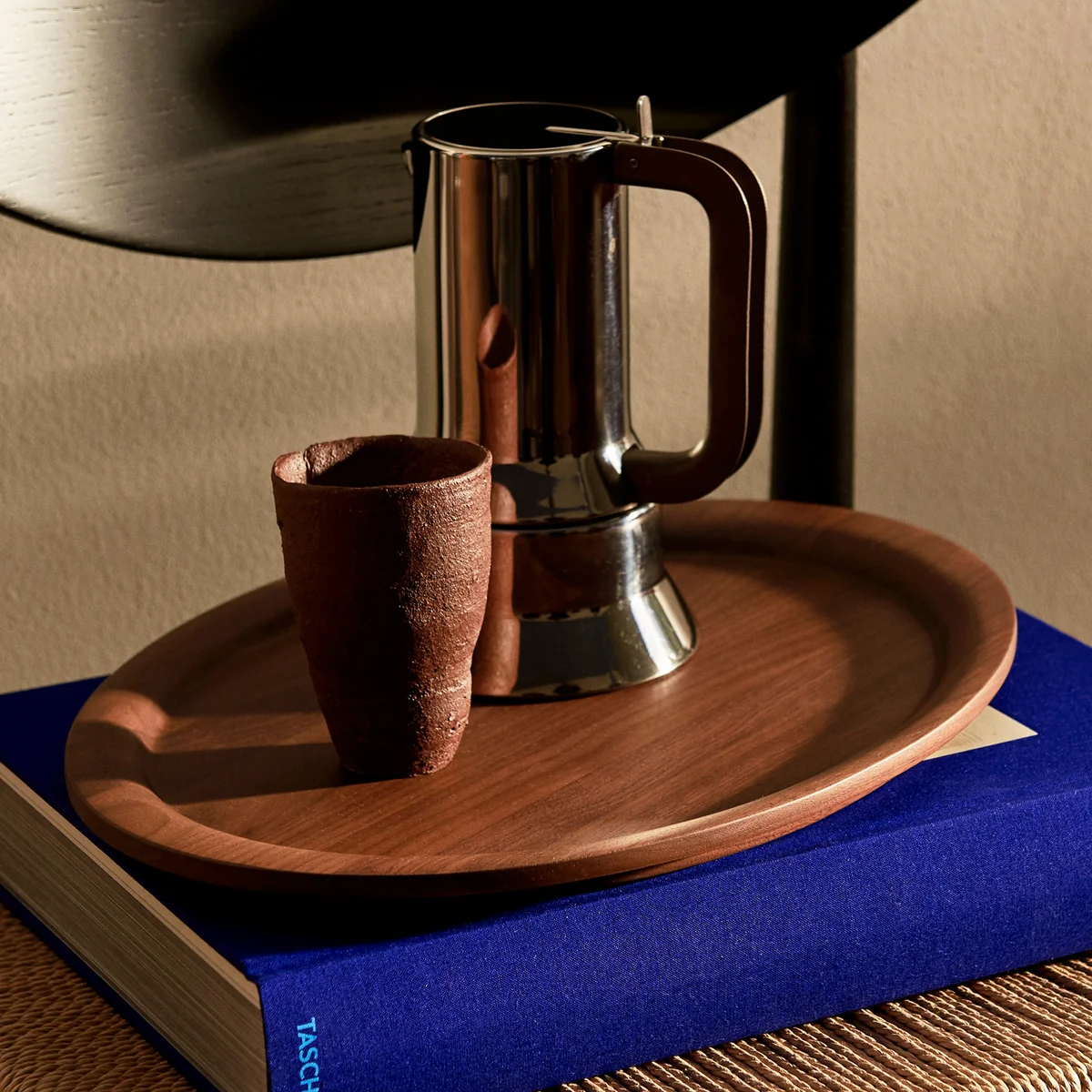 Das Tablett wird wahlweise aus massivem Eichen- oder Walnussholz gefertigt und ist in verschiedenen Grössen erhältlich. Das Holz wird zuerst gefräst, von Hand poliert und schliesslich zum Schutz der Oberfläche lackiert.