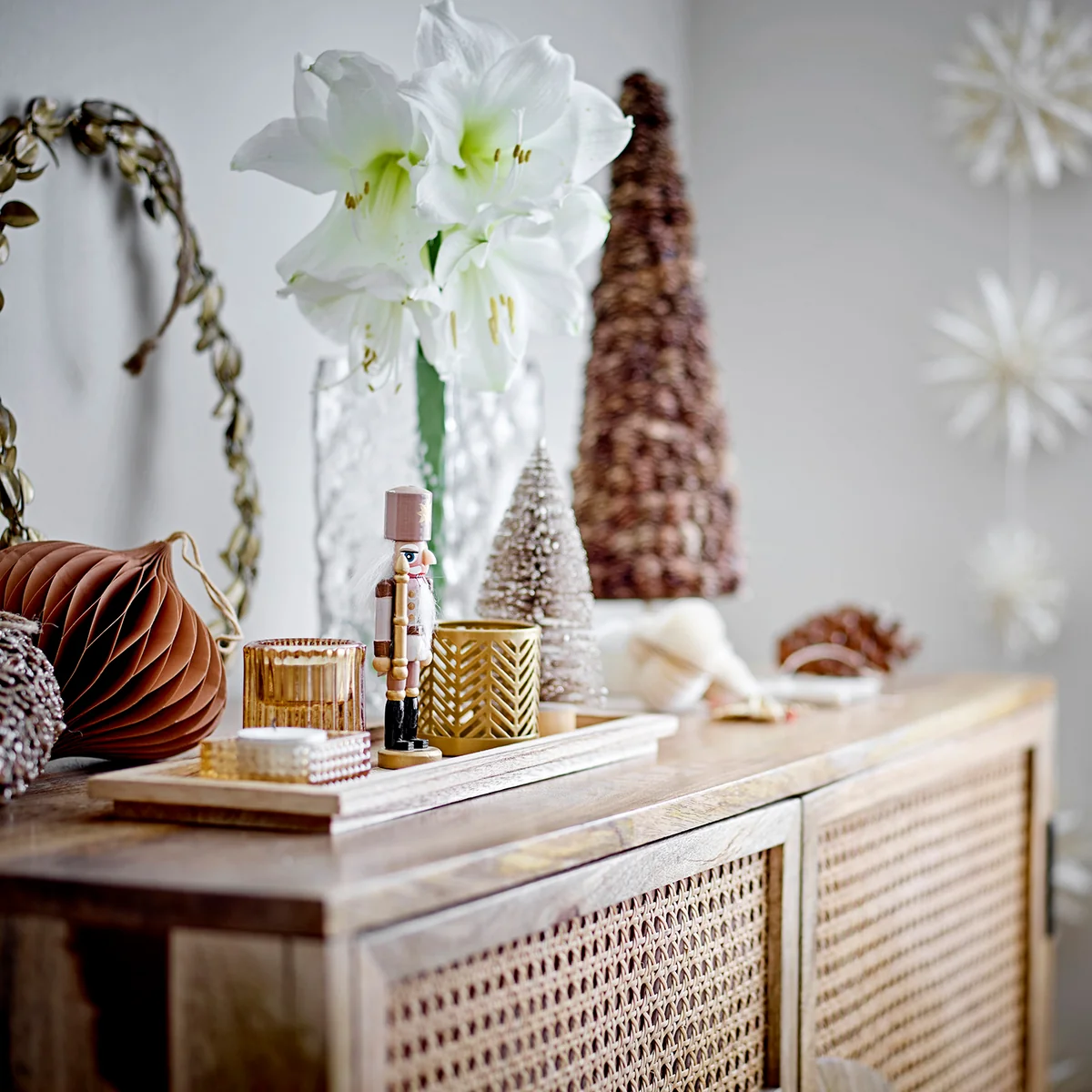 Das Sanga Tablett von Bloomingville ist ein wunderschönes Holztablett, das mit dekorativen Teelichthaltern und einer Tannenfigur geziert ist. Ergänzt mit kleinen Teelichtern, verbreitet das Tablett eine warme und gemütliche Ambiente. Das Kerzenlicht sorgt für eine heimische Stimmung, die gezielt in die kälteren Monate einleitet. Auf der Kommode, dem Esstisch oder der Fensterbank, macht das Tablett eine atemberaubende Figur.