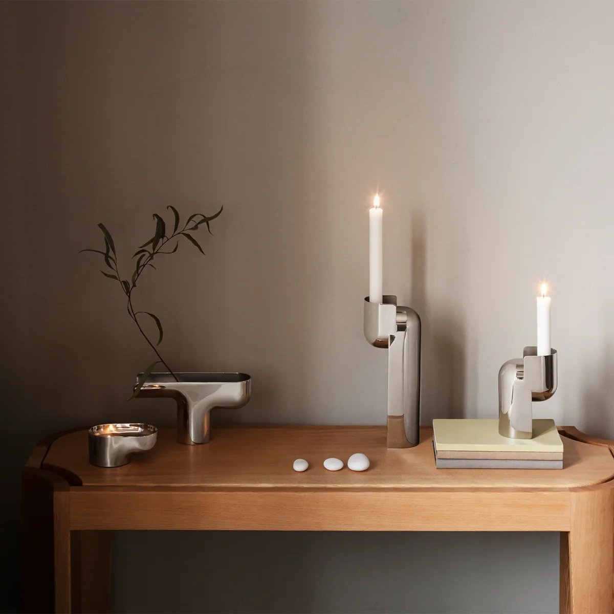 Die Nendo Vase des dänischen Labels Georg Jensen ist ein aussergewöhnliches, zeitgenössisches Designobjekt. Das schöne, skulpturale Objekt ist in jeglichen Wohnräumen, dank seines abstrakten Designs, ein grossartiger Blickfang. Nendo wird aus handpoliertem, massivem Edelstahlguss gefertigt. Durch den Einsatz des massiven Materials sind keine sichtbaren Trennlinien sichtbar, was ihr einen überaus hochwertigen Touch verleiht. Die Vase lässt sich als eigenständige Skulptur nutzen. Sie kann jedoch ebenso ganz klassisch für Blumenarrangements eingesetzt werden.