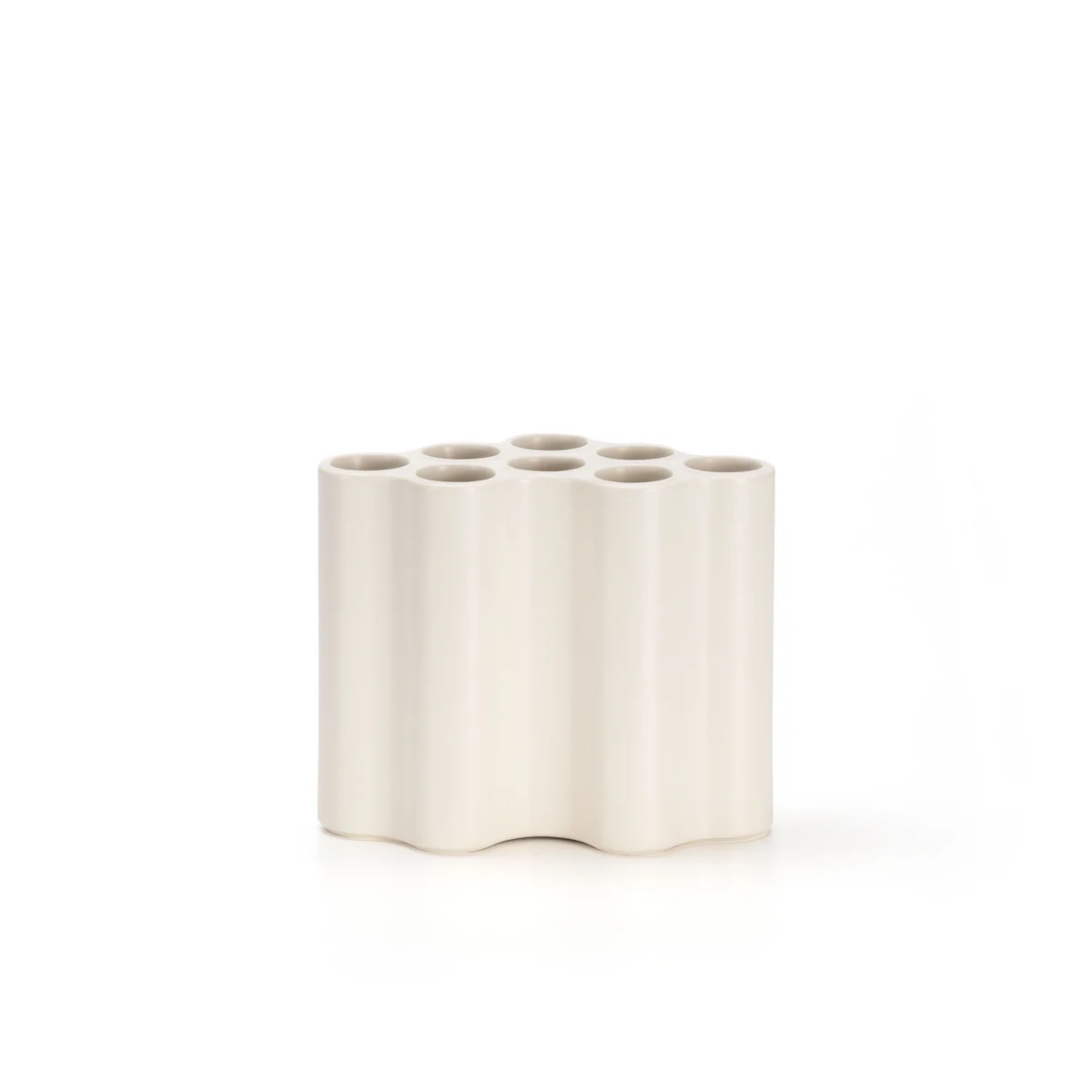 Die Nuage céramique Vase zeichnet sich durch ihre fast schon organische Grundform aus, die an ein Wolkengebilde erinnert und mit sanften Wölbungen auf der Aussenseite für ein reizvolles Spiel aus Licht und Schatten sorgt. Von oben betrachtet zeigt sich jedoch die Struktur aus acht schmalen Röhren, die in Kombination die markante Aussenkontur bilden. In ihnen lassen sich nun einzelne Blumen, Gräser und Äste im Sinne von Ikebana individuell arrangieren.