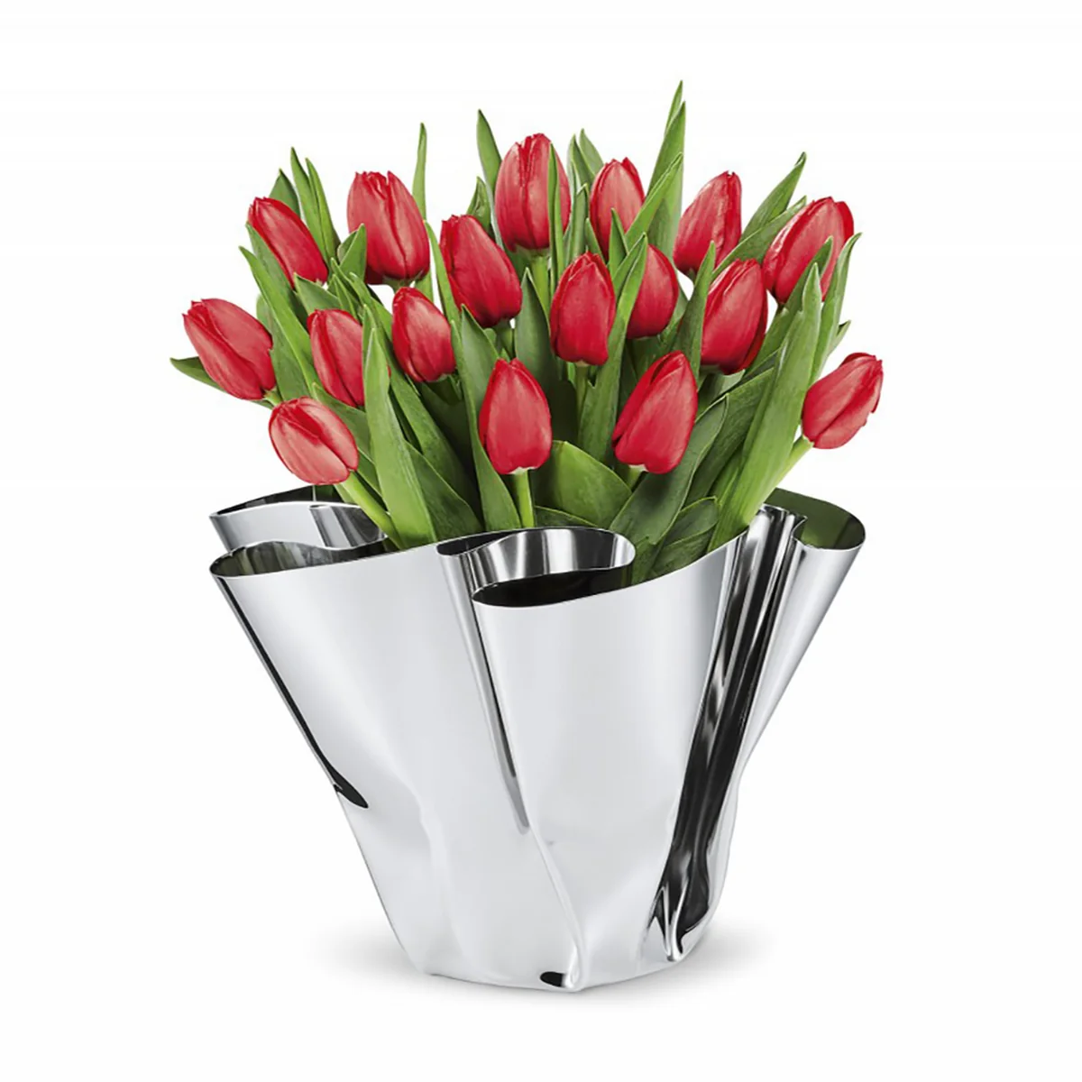 Die Margeaux Vase von Philippi ist aus Edelstahl gefertigt und zeichnet sich durch ihre schwungvolle Form aus. Wie ein Theatervorhang ist das Material in Falten gelegt und wirkt dadurch besonders edel.