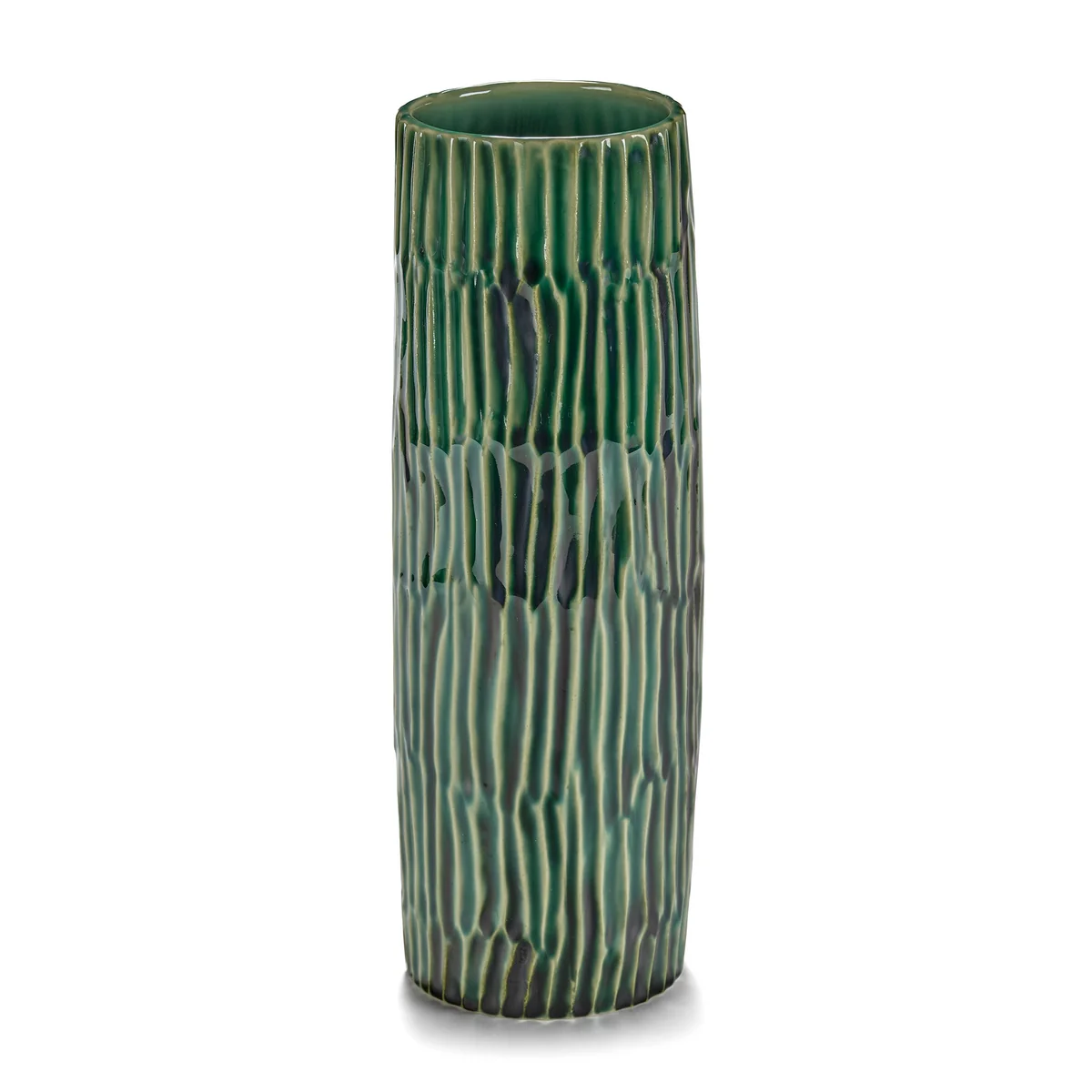 Die Verde Lanza Vase von Pascale Naessens für Serax verbindet Funktionalität mit einem ausdrucksstarken Design. Gefertigt aus Steingut, ist sie von den grünen Fenstern, Türen und der Vegetation auf Lanzarote inspiriert, wo die Designerin häufig lebt. Die sonnengebräunte Glasur in einem natürlichen Grünton wird durch eine muschelartige Textur veredelt, die Naessens selbst mit ihren Fingern eingeprägt hat. Ob für Kochutensilien, Besteck oder Blumen – die Vase ist ein vielseitiges Accessoire, das Küche und Essbereich auf stilvolle Weise bereichert.