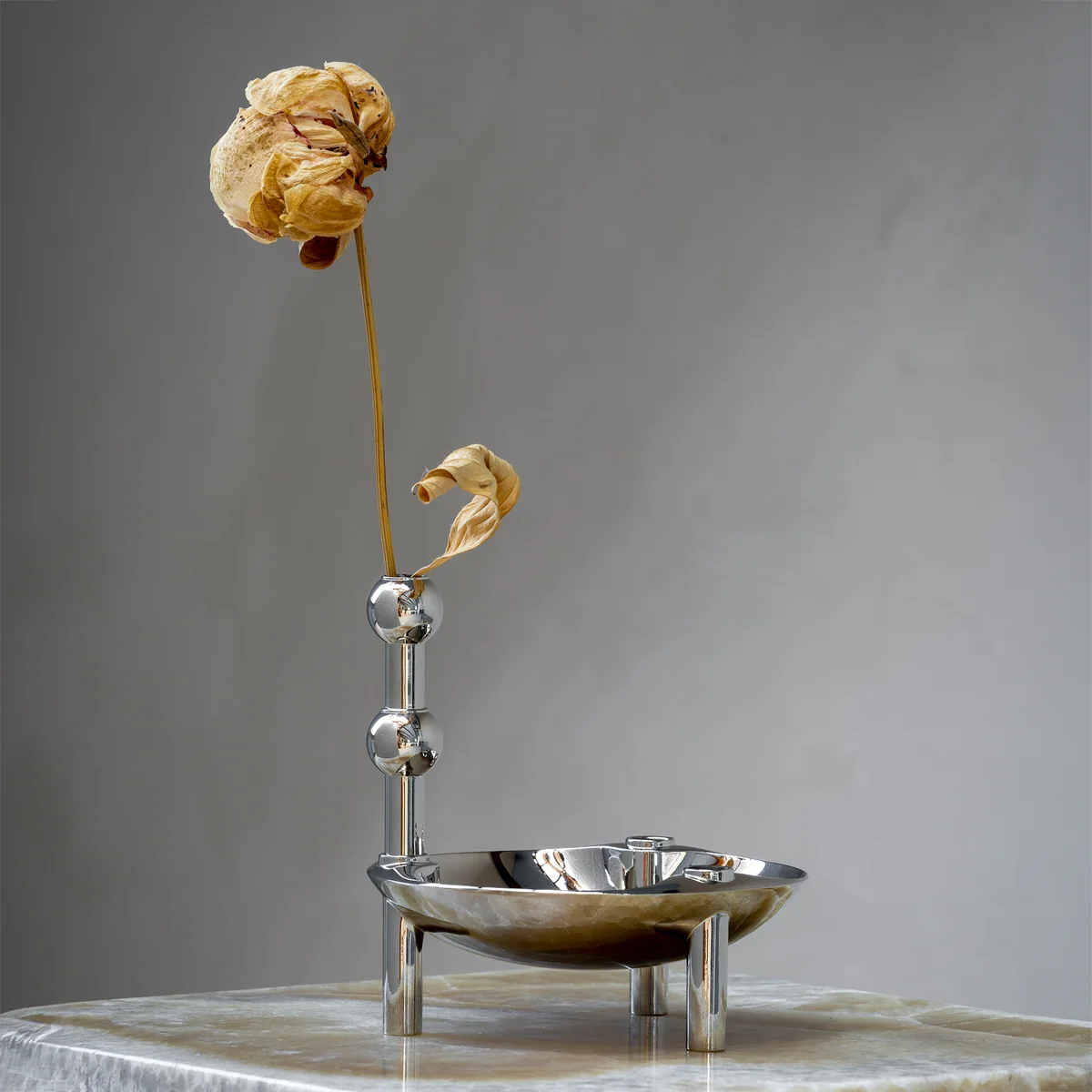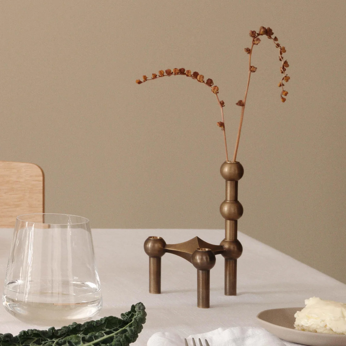 Die Vase von Stoff Nagel ist als natürliche Fortsetzung des charakteristischen Stoff Nagel-Ausdrucks konzipiert und kann sowohl an den Kerzenhaltern, der Schale als auch dem Ständer befestigt werden. Die Stoff Nagel Vase ergänzt das klassische Design um eine zusätzliche Dimension und ermöglicht es, eine farbenfrohe Blumendekoration nach Wahl in die Figur zu integrieren. Je nach Jahreszeit und Trend können sowohl frische als auch getrocknete Blumen in der Vase verwendet werden.