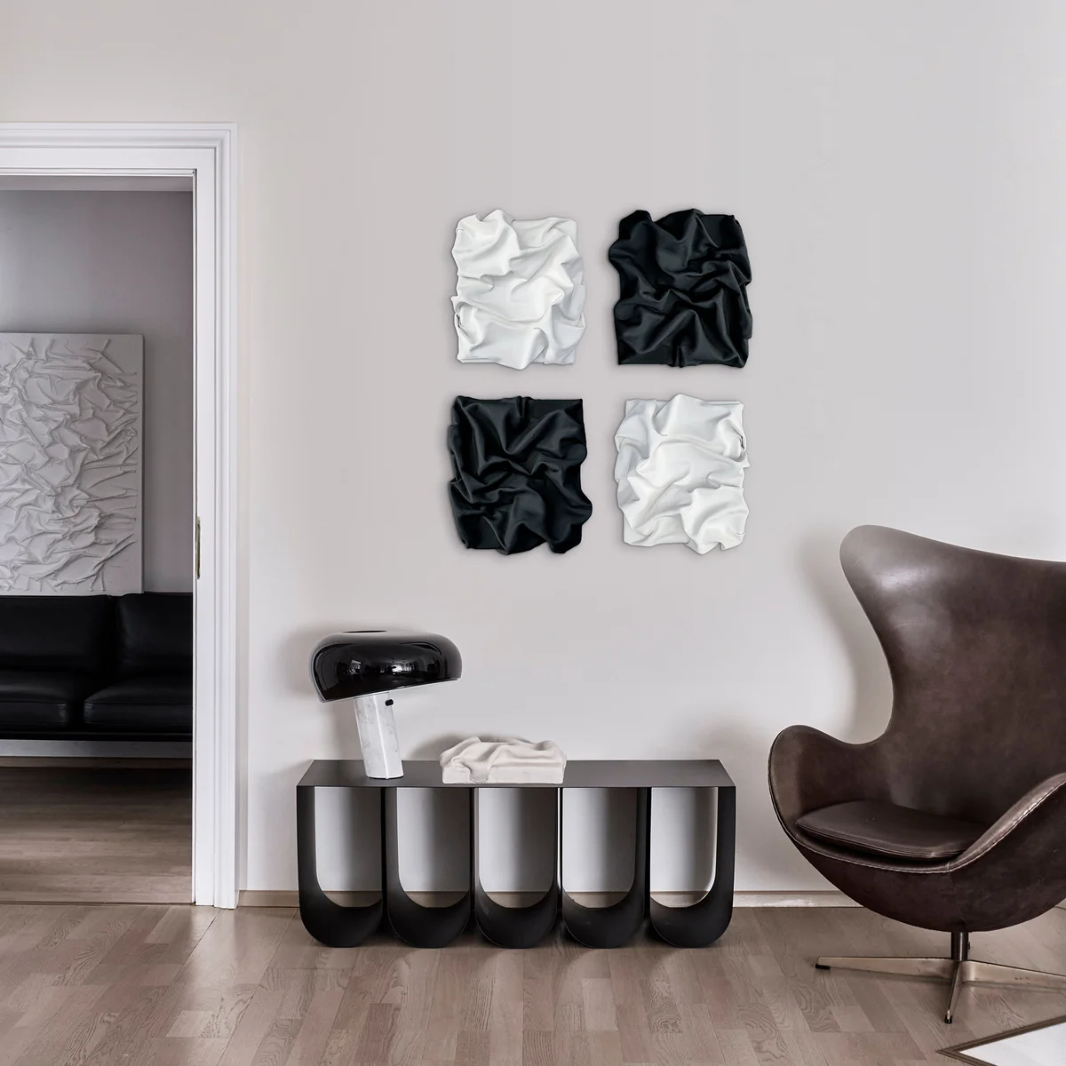 Jedes einzelne 3D-Unikat der Kollektion wird mit grösster Sorgfalt von Hand gefertigt, was zu leichten Abweichungen in der drapierten Form führen kann. Diese Unterschiede sind jedoch normal und tragen zum charakteristischen Charme des Kunstwerks bei.