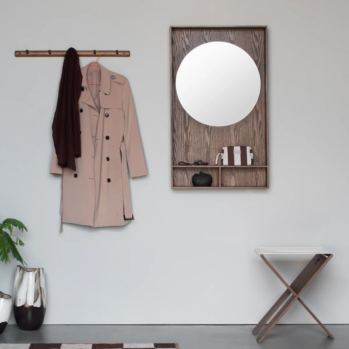 Der SHOW-ME Spiegel mit Regal von Mette Ditmer interpretiert das klassische 70er-Jahre-Spiegelregal neu und verbindet nostalgischen Charme mit zeitgemässer Funktionalität. Der grosse, runde Spiegel wird von einem Regalbrett und zwei kleinen Ablagefächern ergänzt – eine stilvolle Kombination aus Spiegel und Aufbewahrung.