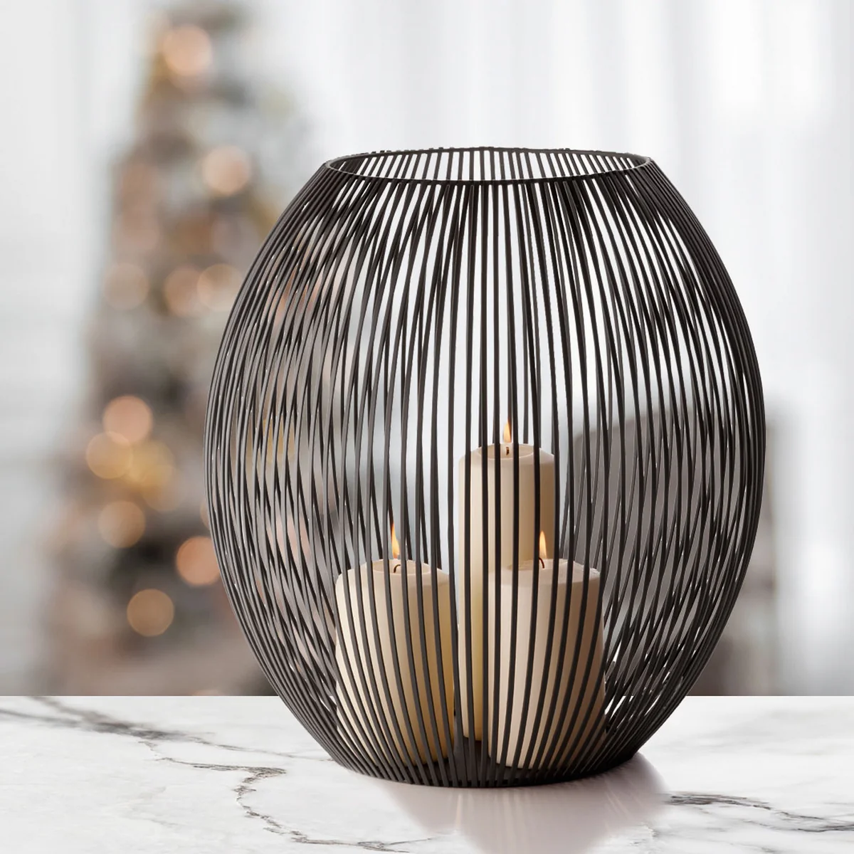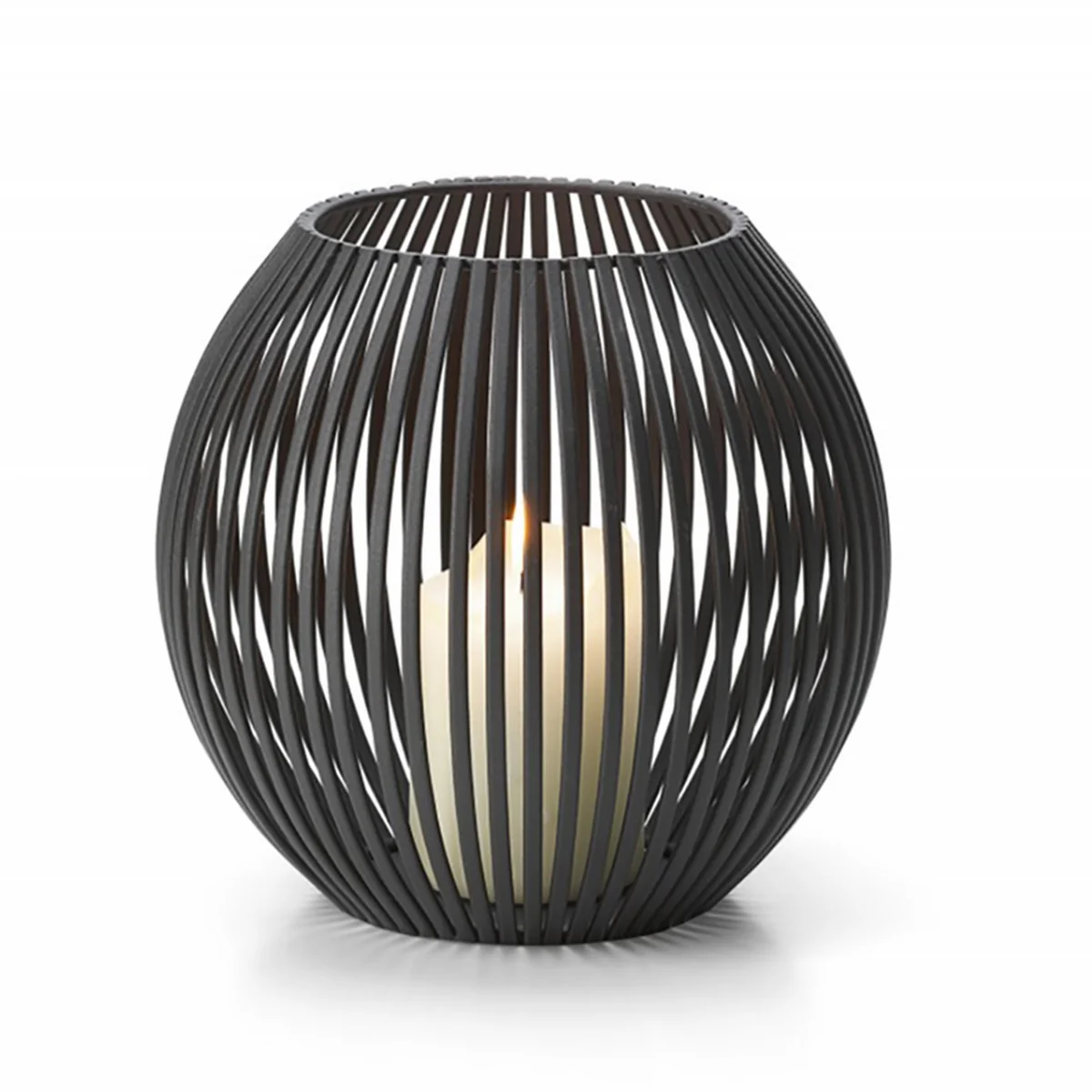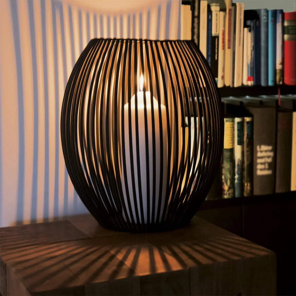 Das Windlicht besteht aus schmalen Lamellen, durch die das Licht der Kerzenflamme hindurch scheinen und so ein Spiel aus Licht und Schatten erzeugt. Seine gewölbte Form sorgt für eine harmonische Gesamterscheinung, die sich hervorragend in jedes Ambiente einfügt.