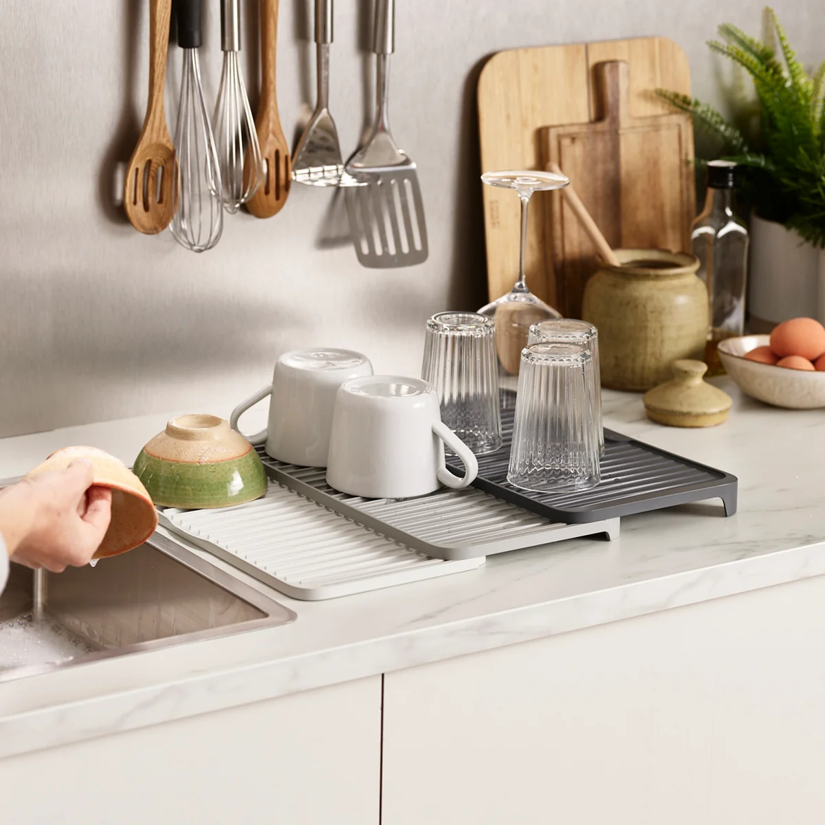 Die Tier ausziehbare Abtropfmatte von Joseph Joseph kann auf mehr als die doppelte Grösse ausgezogen werden und eine grosse Menge Geschirr aufnehmen.