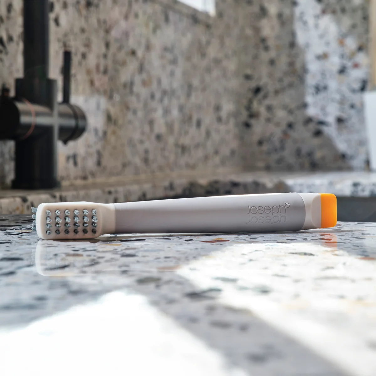 Die kleine CleanTech Reinigungsbürste vereint drei Funktionen in einem kompakten Design: flache Borsten für kleine Flächen, V-förmige Borsten zur Reinigung von Fugen und Ecken sowie einen integrierten Schaber am Griffende zum Entfernen von hartnäckigen Kalk- und Schmutzablagerungen. Ideal für die präzise Reinigung in engen Bereichen wie rund um Armaturen, Fugen oder Zwischenräume von Küchengeräten. Der ergonomische, rutschfeste Griff liegt angenehm in der Hand und ermöglicht gezieltes Arbeiten auch bei schwierigen Reinigungsaufgaben.