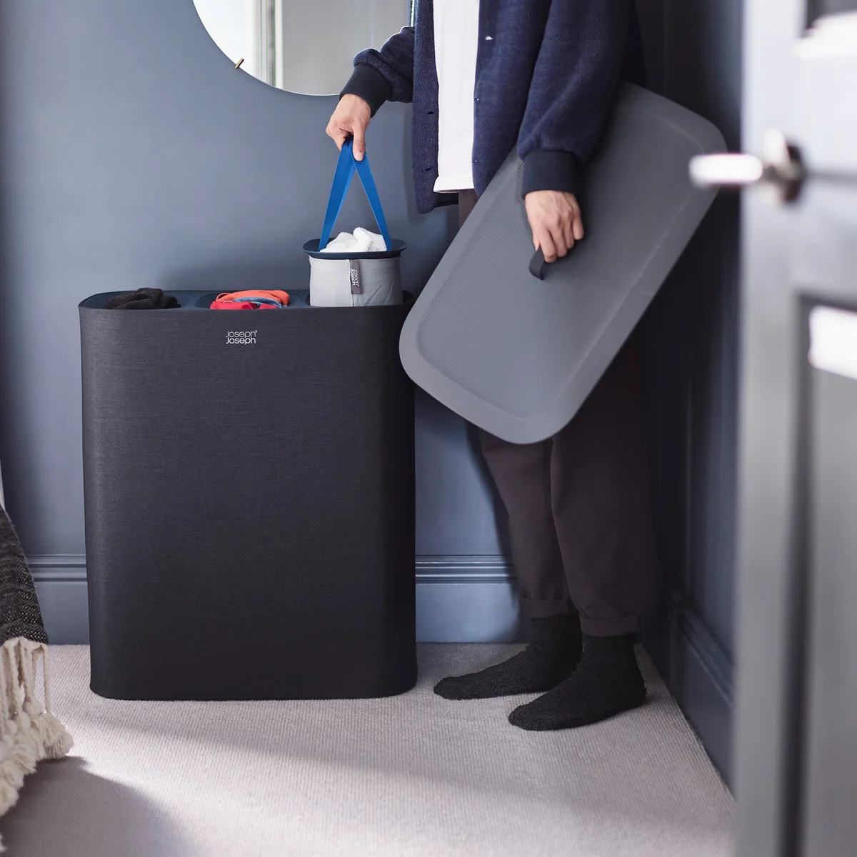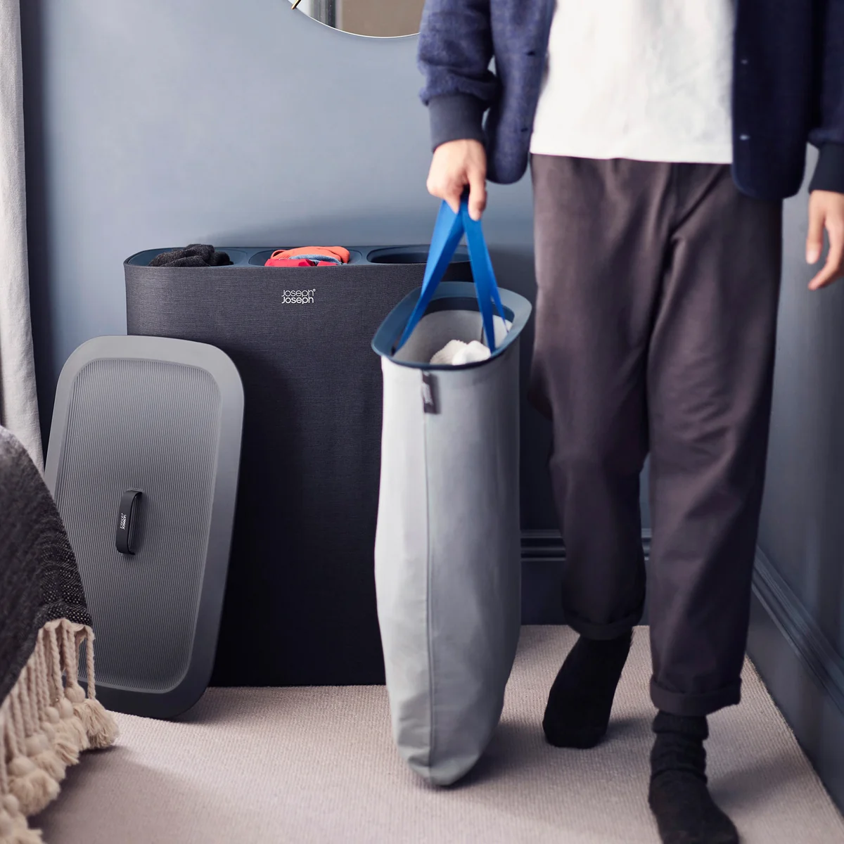 Der Tota Trio Wäschekorb von Joseph Joseph verfügt über eine Vielzahl praktischer Funktionen, die am Waschtag die Arbeit erleichtern: In dem Behälter befinden sich drei Stofftragetaschen, mithilfe welcher die Wäsche in helle, dunkle und bunte Farben getrennt werden kann.