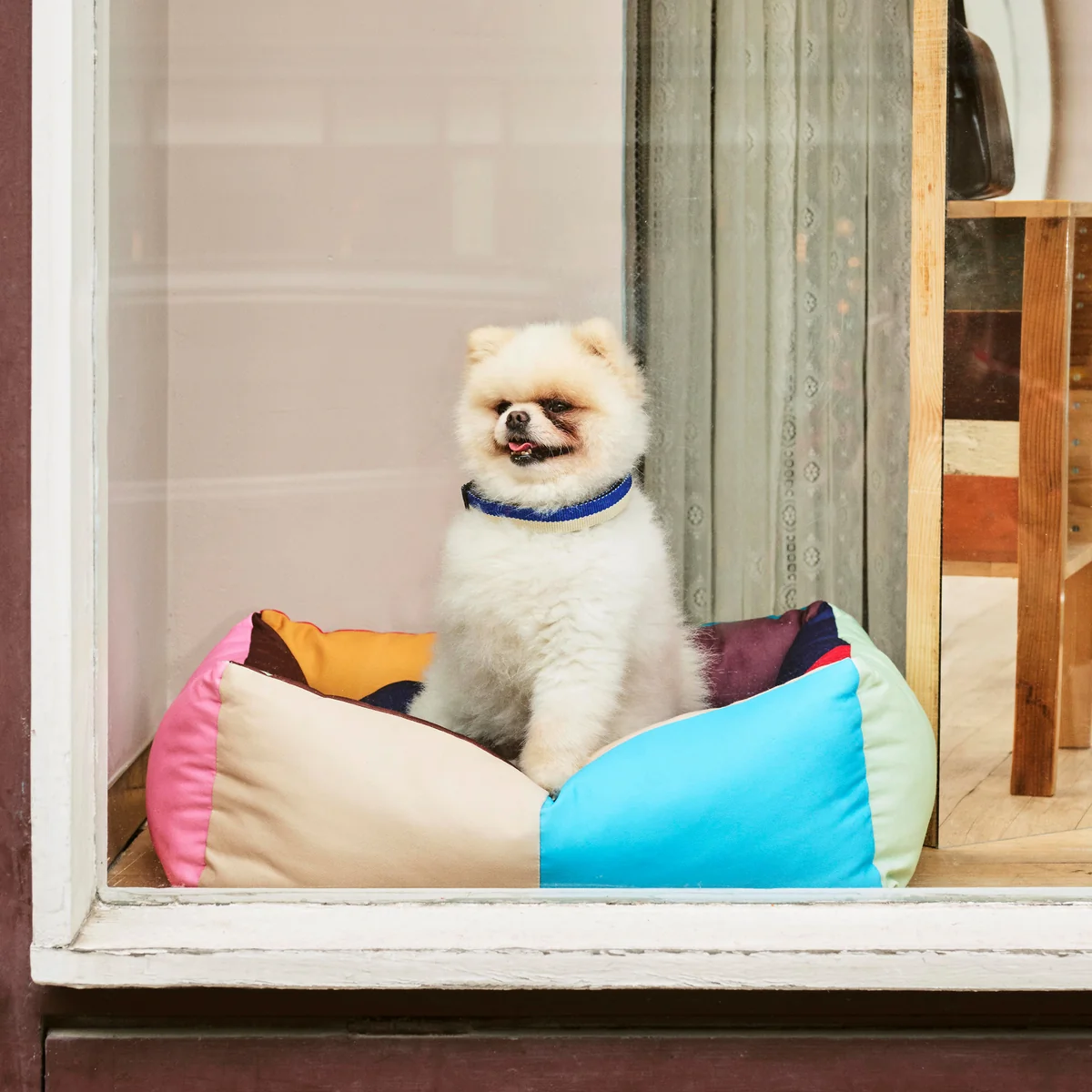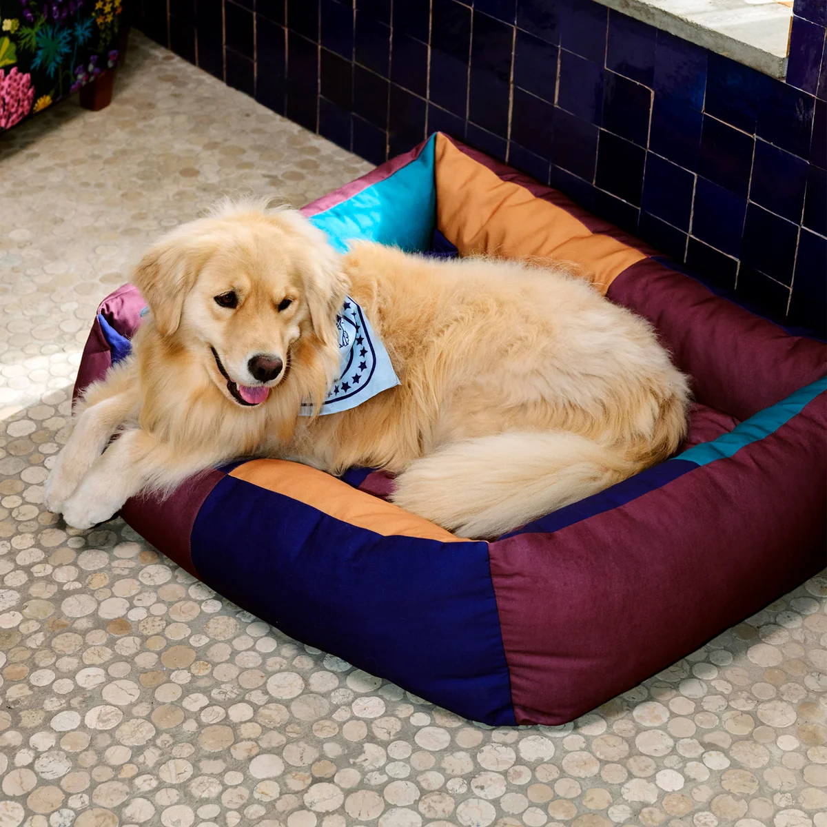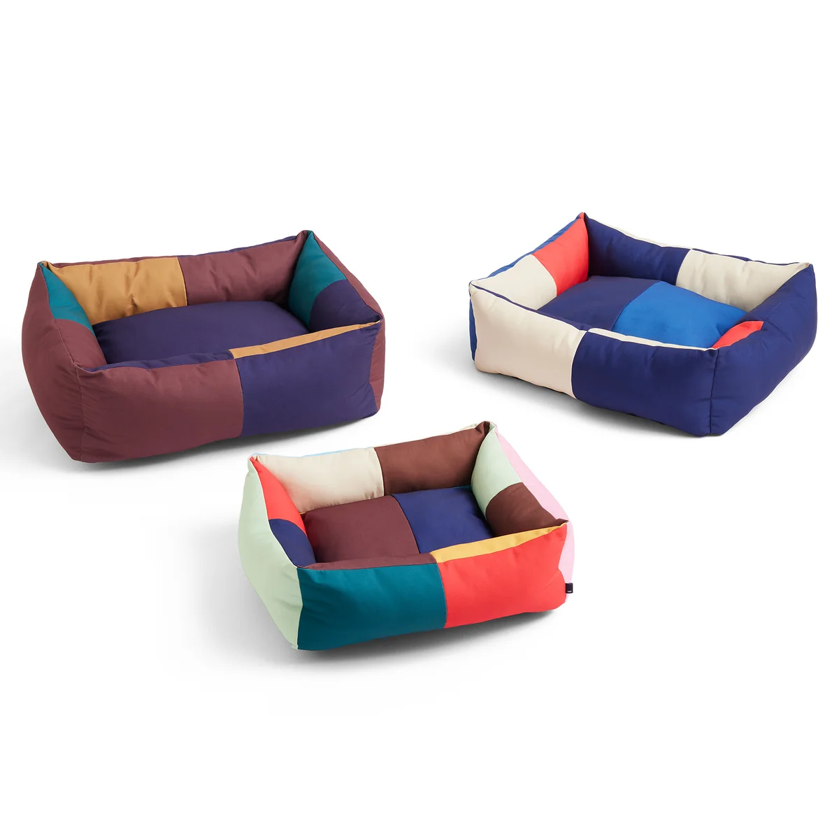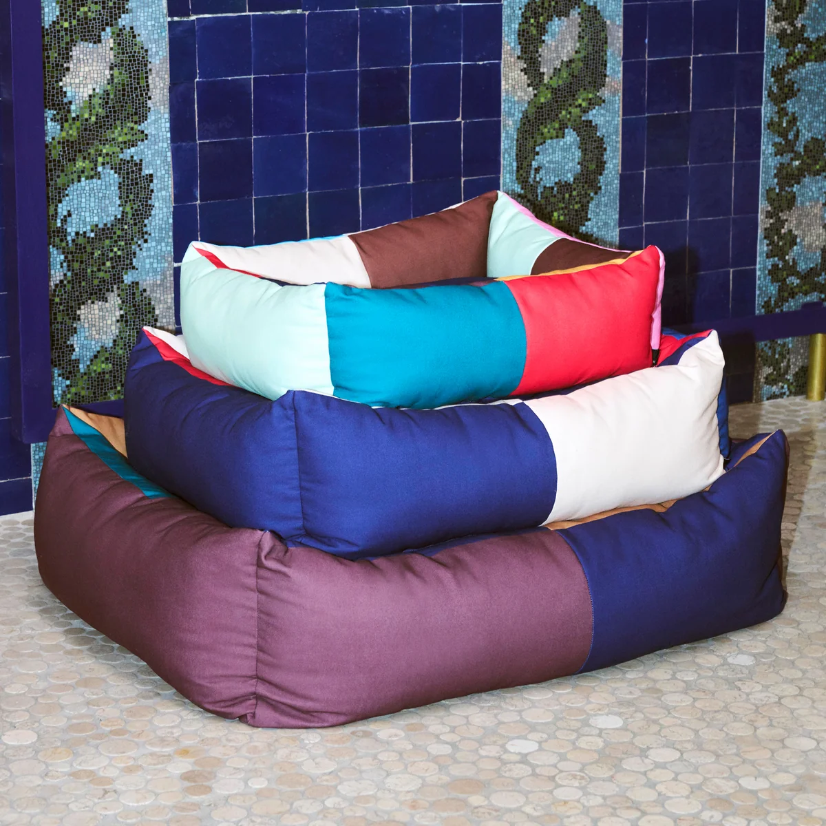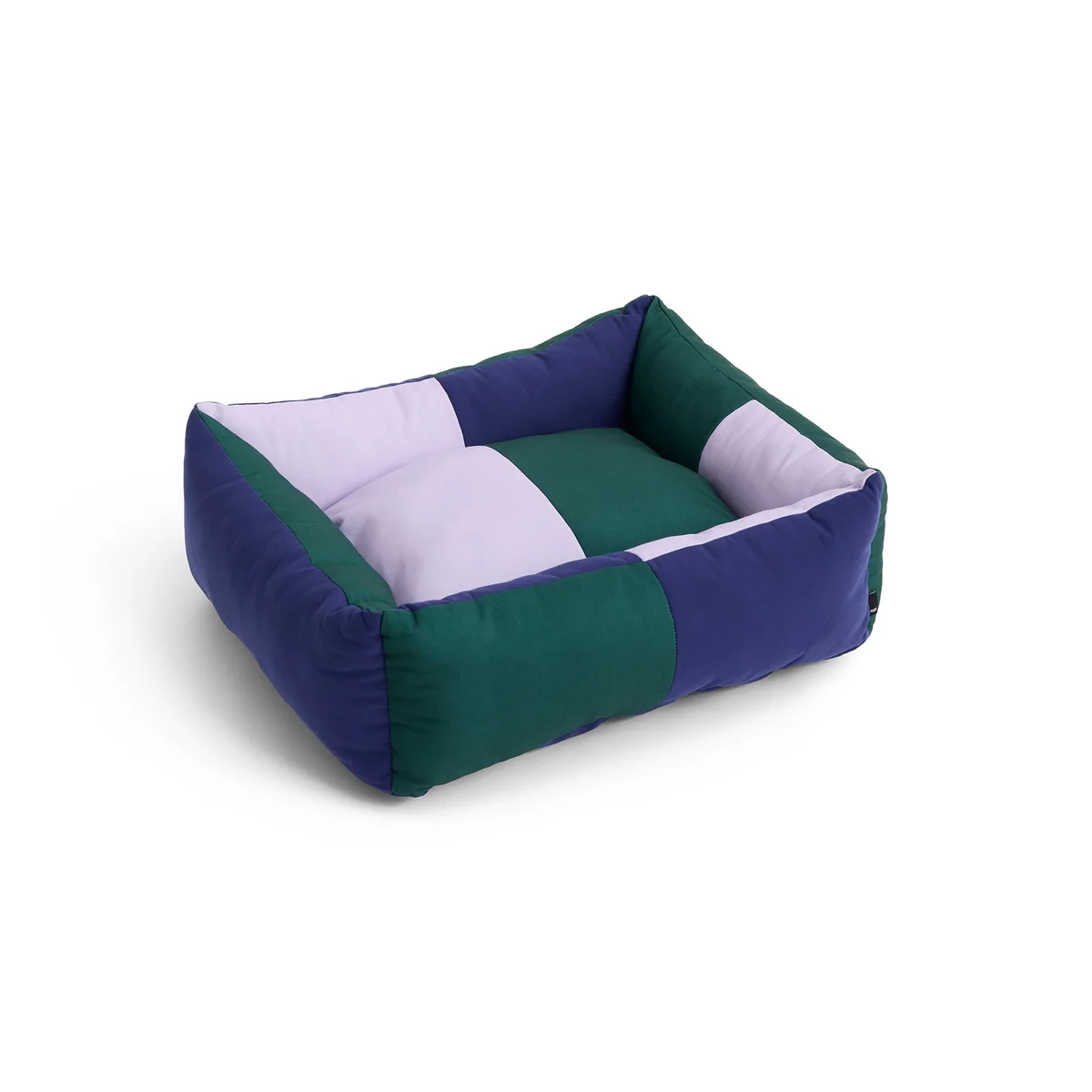 Das Hundebett mit seinem verspielten Farbblock-Design besteht aus robustem, recyceltem Polyester und einem waschbaren, abnehmbaren Kissen, das mit recyceltem Polyester gefüllt ist. Das Bett ist in drei verschiedenen Grössen in unterschiedlichen Designs erhältlich.