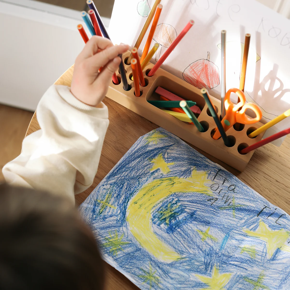 Der Stiftehalter von Nofred ist der perfekte Helfer beim Malen und Basteln. Der aus Eschenholz gefertigt Block verfügt über viele unterschiedlich grosse Löcher, in die nicht nur Stifte, sondern auch Scheren, Radiergummis und sogar Blätter gesteckt werden können. Eine schöne und funktionale Geschenkidee für die Kleinen.