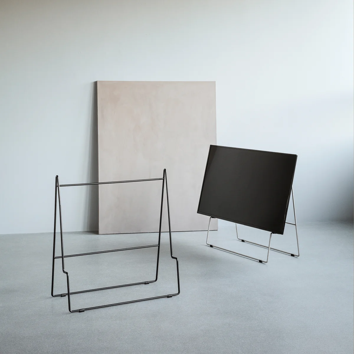 Carry kann wahlweise mit einem gebürsteten Edelstahl-Gestell oder einem schwarz beschichteten Edelstahl-Gestell erworben werden. Die Lederriemen halten Flachbildfernseher mit einer Grösse von 40–65" sicher und fest.