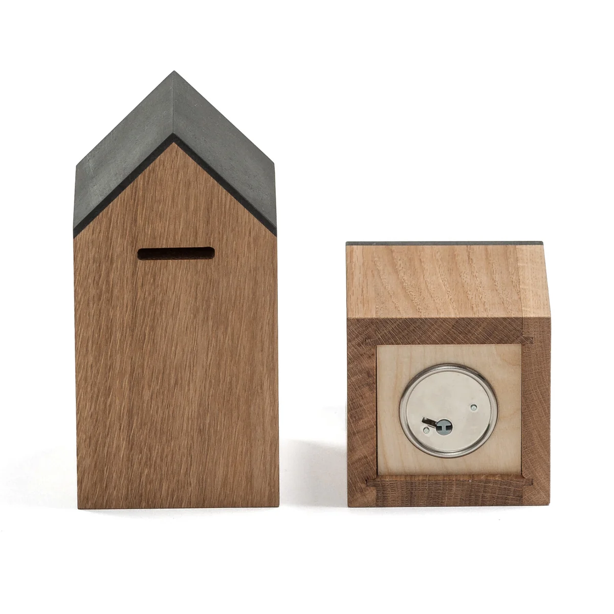 Gefertigt aus massivem, geöltem Eichenholz überzeugt das Sparhaus durch seine klare Linienführung, zeitlose Form und angenehme Haptik. Der Einwurfschlitz ist dezent an der Dachkante integriert, am Boden befindet sich ein praktisches Schloss mit Schlüssel, damit das Gesparte sicher verwahrt ist – und jederzeit zugänglich bleibt.